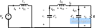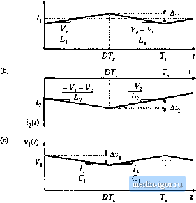 Строительный блокнот Introduction to electronics ![]() ![]() ТПЛГ Fig. 2.21 Cuk coiivcreur circuit: (a) while awitch is in position 1. (b) wliilc switch is in po.sitioii 2. We next assume that the switching ripple maguitude.s in ifi), Jj(f), Vj(0, and vCOare small compared to their respective dc components /j, fj, Vj, and Vj.We can therefore make the small-ripple approximation, and Eq. (2.48) becomes (2.49) During the second subinterval, with the switch in position 2, the converter circuit elements are connected a.s in Fig. 2.21(b). The inductor voltages and capacitor currents are: V12 = - 1э (2.50) We again make the smali-rippie approximation, and hence Eq. {2.50) becomes ici = /1 , (2.51) Equations (2.49) and (2.51) are used to sketch the inductor voltage and capacitor current waveforms in Fig. 2.22. The next step is to equate the dc components, or average values, of the waveforms of Fig. 2.22 2.4 Uii Convener Exaniph Fig. 2.22 Cjk convener wavefoiins: (a) inducior voltage v, [(/), tb) inductor voltage vj2(0, (c) capacitor curi-CLit (.,(/), (d) capacitor cuirent ((-2(0 (b) v (f) h-V/R (=0) to zero, to find the steady-state conditions in the converter. The results are: (2.И) Solution of this system of equations for the dc components of the capacitor voltages and inductor currents leads to Lf s f - D i - - r- d r (2.53) The dependence of the dc output voltage Vj on the duty cycle D is sketched in Fig. 2.23. The inductor current waveforms are sketched in Fig. 2.24(a) and 2.24(h), and the capacitor Fig, Z23 Dt tonvefsion ratio m(d) =- V/V of the Cuk CMivcrter, ![]() voltage waveform vU) is .sketched in Fig. 2.24(c). During thefirst.suhinterval.the .slope.s of the waveforms are given by dt ~ dijt) v,Ji) - V, - V; (2.54) Equation (2.49) lias been u.sed here to substitute for the values of mi and Vr during the first subinterval. During the second interval, the slopes of the waveforms are given by l4g. 2,24 Cuk cnriveiiei waveftums: (a) inductor current i(r), (b) inductor СПГГЙ11Е fj(/), (c) capaciuii voltage V(/). ![]() |