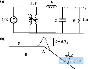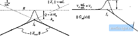 Строительный блокнот Introduction to electronics Fig. 8.56 Construction of the conlrol-to-output transfer function GJs) for the buck converter: (a) circuit modeh (b) relevant impeiJance asymptotes; (c) transferfunction Cj:j). 0>) (e) (it) ![]() ![]() The quantities \\ Z \\ and \\ Z, (! tue constructed in Fig. 8.56(b). According to Ь]. (8.175), we can construct [ Gj(i) [ by finding tlte ratio of (( Z , and [[ Z, ((, and then scaliitg the result by V. Far f<f,j, II Zj, and II II are both equal to OiL and hence Z , / Z, is equal to 1. As illustrated in Fig. 8.56(c), the low-frequency asymptote of Ц has value V For/>/f I! 2, , 11 has asymptote У<ОС\ and IJ Z I) i s equal to(liL Hence, [ Z /1 Z, has asymptote UiiiLC, and the high-frequency asymp-tt>te of II Gj.s) II is equal to V/iHLC. The Q-factor of the two pt>les at f-fi, is again equal toR/Kf,. The line-to-output tran.sferfunction G,(s) is found with the d(s) sources .set to zero, as in Fig. 8.57(a). This circuit contains the same voltage divider as in Fig. S.56, and additionally contains the l:D transformer. The transferfunction 0(s) can be expressed as Fig. 8.57 The hne-to-output transfer function C(s) f[>c the buck converter: (a) circuit mode); (b) magnitude asymptotes. ![]() II Gis) s.5 Measureinen! of AC Transfer Funclions and Impedances Network Analyzer Itection source Magnitude Frequency 9 Output i-O- Measured inputs Input Input Data