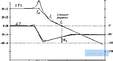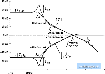 0 -270 1 He 10 № 100 Hz 1 Шг lOkHi 100 kHi Hg. 9.9 Magnilude mid phase yf the loop gain of an unstable system, Tbe phase margin (p, is negative. To compute the phase margin (p, , the phase of the loop gain Tis evaluated at the crossover frequency, and 1S0° is added. Hence, Ф ,= ШГ + ZT{flnf,] (У,20) If there is exactly one crossover frequency, and if the loop gain T{s} ctmtain.s no right half-plane poles, then the quandties 1/(1 + T) and 77(1 + T) contain no right half-plane poles when the phase margin defined in Eq. (9.20) is positive. Thus, using a simple test on T(s), we can determine the stability of ГД1 + T) and 1/(1 + T). This is an easy-to-use design tool-we simple ensure that the phase of T is greater than -180° at the crossover frequency. When there are multiple crossover frequencies, the phase margin test may be ambiguous. Also, when Tcontains right half-plane poles (i.e., the original open-loop system is unstable), then the phase margin test cannot be used. In either case, the more general Nyquist stability theorem must be employed. The loop gain of a typical stable system is shown in Fig. 9.8. It can be seen that ZTQlTlD = -112 . Hence, ip. = 180 -112= +68. Since the phase margin is positive, 77(1 + T) and 1/(1 + T) contain no right half-plane poles, and the feedback system is stable. The loop gain of an unstable system is sketched in Fig. 9.9. For this example, ZT{j2Kfj) = -230. The phase margin is ф , = 180 - 230 = -50 . The negative phase margin implies that r/(l +T) and 1/(1 + T) each contain at least one right half-plane pole. 9.4,2 The Relationship Between Phase Margin and Closed-Loop Damping Factor How much phase margin is necessary. Is a worst-case phase margin of 1 satisfactory? Of course, good designs should have adequate design margins, but there is another important reason why additional phase margin is needed. A small phase margin (in T) causes the closed-loop transfer functions 77(1 + T) and 1/(1 +7) to exhibit resonant poles with high Q in the vicinity of the crossover frequency. The system transient response exhibits overshoot and ringing. As the phase margin is reduced these characteristics |