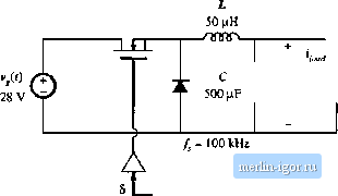0* -90* -180 Fisj. 9.21 Magnitude and phase asymptotes of ttie combined (P!D) compensator transfei funcdon G of Eq, (9,43). A typical Bode diagram ot a practical version of this compensator is illustrated in Fig. 9.21. The compensator has transfer function (4,43) The inverted zero at frequency j) functions in the same manner as the PI compensator. The zero at frequency/adds phase lead in the vicinity of the crossover frequency, as in the PD compensator. The high-frequency poles at frequencies and/J,j must be present in practical compensators, to cause the gain to roll off at high frequencies and to prevent the switching ripple from disrupting the operation of the pulse-width modulator. The loop gain crossover frequency is chosen to be greater than Д and , but less than fpi and/j,3. 9.5.4 Design Eicample To illustrate the design of W and PD compensators, let us consider the design of a combined PID compensator for the dc-dc buck converter system of Fig. 9.22. The input voltage vit) for this system has nominal value 28 V. li is desired to supply a regulated 15 V to a 5 A load. The load is modeled here with a 3 Й resistor. An accurate 5 V reference is available. The first step is to select the feedback gain H{s). The gain H is chosen such that the regulator produces a regulated 15 V dc output. Let us assume that we will succeed in designing a gMxi feedback system, which causes the output voltage to accurately follow the reference voltage. This is accomplished via a large loop gam T, which leads to a small error voltage: \\, ~ 0. Hence, Ilv ~ v.. So we should choose (Ч.44) The quiescent duty cycle is given by the steady-state solution of the converter: ![]() Transistor gate driver