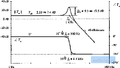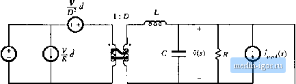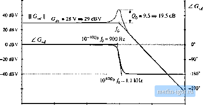 Compensator His) 4s) 1m = 4V Fig, 9.23 System small-signal яс model, design example. Tis) v.. 2 f9.45) Tlie quiescent value ofthe control vtdtage, V, must satisfy Eq. (7.173). Hence, V, = DV =2.14 V (9.46) Thtis, the quiescent conditions ofthe system are known. It remains to design the compensatorgain G{s). A small-signal ac model ofthe regulator system is illustrated in Fig. 9.23. The buck converter ac model is represented in canonical form. Disturhances in the input voltage and in the load current are modeled. For generality, reference voltage variations are included in the diagram; in a dc voltage regulator, these variations are normally zero. The t)pen-loop converter transfer functions are discussed in the previous chapters. The open-loop control-to-output transfer function is (9.47) The ореп-кюр control-to-output transfer function contains two poles, and can be written in the foltowing normalized form; 60 dBV ![]() 10 Ki 100 Hi IkUz Fig. 9.24 Converter small-signal comrol-to-output transfer function (7, (jesign exannple, 10 kHz lOOkHz C.,(s) = G, --l + By equating like coefficients in Eqs. (9.47) antl (9.48), one finds that the dc gain, corner frequency, and Q-factor are given by t;=0 = 28V e.= R\/Y = 9.5 19.5 dB (9.49) In practice, parasitic loss elentents, such as the capacitor equivalent series resistance (esr). would cause a lower Q-factor tt) he observed. Figure 9.24 contains a Bode diagram of G.Js). The open-l(Xip line-to-output transfer function is (9.50) This transfer function contains the same poles as in Gs), and can be written in the normalized form (9.S1) with G o = D. The open-loop output impedance of the buck converter is l+s+.iLC (9.52) Load current variation ac line varialion ![]() vanalion ![]() Convener power stage fig. 9.2s System bioclc diagram, design example. Use of the.se e(]uatioiis to reptesent the converter in block-diagratri form leads to the complete systetn block diagram of Fig. 9.25. The loop gain of the system is Substitution ofEq. (9.48) into (9.53) leads to aSs)H(s) V (9.53) (5.54) ![]() 10 Нг 100 Hi 1кНг 10 Ш£ Fig. 9.26 Uncompensated loop gain design exatnple. |