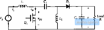 Строительный блокнот Introduction to electronics 2.6 SUMMARY OF KEY POINTS 1. The dc compoiiem ot ii converter waveform is given by its average value, or die integral over one switching period, divided by ihe switching period. Soluiion of a dc-dc converiei lo find iis dc, or steady-state, voltageR and currents therefore involves averagiiig the waveforms. 2. The linear- (or small-) ripple approximation greatly simplifies the analysis, tn a well-designed converter, the switching ripples in the inductor currents and capacilor voltages are small compared to Ihe respective dc componeiits, and can be neglected. 3. The piincipte of inductor volt-second balance allows determination of the dc voltage components in any switching converter. In steady state, the average voltage applied to an inductor must be zero. 4. The priticiple of capacitor charge balance allows deiertuination of the dc componeiits of the iiiducior currents in a swilching converter, tn steady stale, Ihe average currenl applied to a capacilor must be zero. 5. By kiiowledge of the slopes of the inductor current and capacitor voltage waveforms, the ac switching ripple magnitudes may be computed. Inductance and capacitance values can then be chosen to obtain desired ripple magnitudes. ft. In converlers coiitaining tmiltiple-pole filters,contiiinous (nonpulsating) voltages and currents are applied 10 one or more of the inductors or capacitors. Computation of the ac switching ripple in these elements can be done using capacitor chaige and/or iiiditctor fliix-linkage arguments, without use of the small-ripple approximaiioti. 7. Converters capable of increasing (boost), decreasing (buck), and inverting the vohage polarity (buck-boost and Clik) have been described. Conveiter circuits are explored more fully in the problems and in a later chapter. REFERENCES llj S. Ci;k, Basics of Switched-Mode Power Conversioii: Topologies, Magnetics, and Control, in Advances in SwiKhei!-Mi)de Power Conversiim, Vol. Z, pp. 27У-31(), Irvine, CA; Teslaco, 1W81. 12! N. Mohan, T. UlSDEUkKD, and W. Robbin.s, Posver Elearonics: Converters, Applications, and Design. 2 edir. New York: John Wiley & Sonn, 1995. [i\ J. K.ASSAKIAN, М. SciiLECltr, and G. Veroese, Principles of Power Etectrtmics, Reading, MA: Addisoti- Wesley, 1991. (4] R. Severns and G. E. Bloom, Madern Dc-to-dc Switch Mode Power Converter Circuits. New York: Van Nostrand Reiiihold, I9S5. 15] D. Hart, Introduction to Power Electronics. New York: Prentice Hall, 1997. [6] M. RAsmn, Power Electronic.:: Circuits. Devices, and Applications, 2 edit., New York: Prentice Hall, 1993. 17] P. Krein, Elements ofPower Electronics, New York: Oxford University Press, 199s. IS] K. Kit Sum, Switch Mode Power Conversion-Ba.iif Theoiy and Design. New York: Marcel Dekker, 19S4. Problems Problems 2.1 Analysis and design of a buck-boost converter: A buck-boosL converter is illLstraLed in Fig. 2.28(a), and apractical implementation using a iransisiorand diode is shovn in Fig, 2,28(b). Fig. 2,2S Buck-boost convenei of Problem 2.1: (a) idtal convener circuit, (b) implemctitatioti using MOSFET and diode. -O I 0-[- ![]() (b) (c) Find tlie dependence of ttie equilibrium output voltage Vand inductor current / on tlie duty ratio A input voltage V and load resistance R. Уш may assume that ihe inductor current ripple and capacitor voltage npple are small. Plot your results of part (a) over the range 0 < Л £ 1, DC design: for the specifications V = 30V U = -20V R = 4L1 y; = 40 kHz (i) Find D and / (ii) Calculate the value ofL that will make the peak inductor current ripple Де equal to ten per- cem of the average inducior current /. fiiij Choose С such that the peak output voltage ripple Atis 0,1 V. Sketch the transistor drain current vaveform for your design of pari (c). Include the effects of inductor current ripple. What is the peak value of f . Also sketch ij(f) for the case when L is decreased such that Ai is 50% off. What happens to the peak value of fj- in this case? Sketch the diode current waveform ( (г) for the two cases of pan (d). In a certain application, an unregulated dc input voltage can vary between IS and 36 V. ll is desired to produce a regulated output of 28 V to supply a 2 A load. Hence, a converter is needed that is capable of both increasing and decreasing ihe voltage. Since the input and output voltages are boih positive, converters that invert the voltage polarity (such as the basic buck-boost converter) are not suited for this application. One convener thai is capable of performing ihe required function is the nonisolated SEPIC (single-ended primary inductance convener) shown m Fig. 229. This convener has a conversion raho M(fl) that can both buck and boost the voltage, but the voltage polarity is not invened. In the normal converter operaiing mode, the Iransistorconducls during ihe first subinterval [0 < t < DTJ, smd the diode conducts during the secondsubinterval {DT < j < 7 ). You may assume that all elements are ideal, (a) Derive expressions for the dc components of each capacitor voltage and inductor current, as functionsof the duly cycle D, the input voltage V , and the load resistance R. ![]() Fig. 2.29 sepic of Problems 2.2 and 2.3, (b) A control circuit aatomaticitlly adjusts the conveiler dttty cycle D, to maintain a constant output voltage of 1= 2K V. Jhe iiiput toltage slowly varies over ttie raiige LS V < 36 V. The load current is constant and equal to 2 A. Over wtiat range will the duty cycle D vary? Over what range will ttie input inductor current dc component vary? For the SEPIC of Problem 2.2, Derive expressions for each inductor curiCiit ripple and capacitor voltage ripple. Expiess ttiese quantities as functions of the switching period V,; the component val ties l L, C, C; iheduiy cycle D: the inpttt voltage V; and the load resistance R. (b) Sketch the waveforms of the transistor voltage 1,и(г} and transistor current r ((}, and give expi-essions for tiieir pea