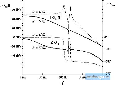 Строительный блокнот Introduction to electronics 120 V ![]() Fig. 11,20 SEPlC example. aodBV ![]() 50 kHz Fig. 11.21 Magnitude and pha.4c of the eoiitrol-to-mitput transfer fiiiiction oblaiuetl by siintikuloii of the SEPEC exatnple .shown in Fig. 11.20, for two viihics of the load resi.itiiiiee: fi = ЧОП when the eotiverter operates in DCM (solid liiie.s), and fi - 40fl for which die converter operates in CCM (diished lines). the simulation setup are described in .Appendix B, Section B.2.1. Figure I 1.21 shows raagnititde and phase responses of the conhol-to-output transfer function obtained for two different values of the load resistance; A! =40 £2, for which the converter operates in CCM, and R - 50 i2, for which the converter operates in DCM. For these two operating points, the quiescent (dc) voltages and currents in the circuit are nearly the same. Nevertheless, the frequency responses are qualitatively very different in the two operating modes. In CCM, the converter exhibits a fourth-order lespon.se with two pairs of high-Q complex-conjugate poles and a pair of complex-conjugate zeros. Another RHP (tight-half plane) zero can be observed at frequencies approaching 50 kHz. In DCM, there is a dominant low-frequency pole followed by a pair of complex-conjugate poles and a pair of complex-conjugate zeros. The frequencies ofthe complex poles aitd zeros are very close in value. A high-frequency pole and a RHP zert) cttntribiite additit)nal phase lag at higher frequencies. 11.3 HIGH-FREQUENCY DYNAIVHCS OF CONVERTERS IN DCM As discussed in Section 11.2, transfer functions of converters operating in discontinuous conduction mode exhibit a dominant iow-freqtiency pole. A pole and possibly a zero caused by inductor dynamics, are pushed to high frequencies. To correctly model the high-frequency dynamics of DCM converters, one must account for the fact that the ac voltage across the inductor is not zero. Equation (11.12) is employed in Section 11.1 to greatly simplify the equations of the DCM averaged switch model. Although this model gives good restdts at low frequencies, it cannot accurately predict high frequency indtictor dynamics because it implies that the ac inductttr voltage is zero. A more accurate approach is employed in this section. The subinterval length f/ is fotmd by averaging the inductorcurrent waveform ifj) of Fig. 11.3 [4-6]: (11.64) Solution for(V2(/) yields: d2(t) = -diO = RXd){idit)). (11.65) Equation (11.65), together with Eqs. (11,3), (11,4), (11.7), and (11.10), constitutes a large-signal averaged inttdel in DCIVI that can be tised to investigate steady-state behavior, as well as low-frequency and high-frequency dynamics. Unfortunately, the model equations are more involved, and do not allow elimination of all converter voltages and currents in terms ofthe switch network average terminal waveforms. Let us use this model to find predictions for the high-frequency pt>le caused by the inductor dynamics of DCM converters. Consider the btick-boost cttnverter of Fig. 11,2 having the DCM waveforms shown in Fig. 11.3, The average transistor voltage and the average diode current are selected as the switch network dependent variables. Substitution ofEq. (11.65) into Eq, (11.3) yields , , и , , R,(r/){i (/))v(0). ,/(f) ь(0),ч-(0)м,.-40(ИО) - - -J (11.66) The averaged switch voltage {Vf(f}}j. in Eq. (11,66) is a nonlinear function of the switch duty cycle, the average indtictor current, and the average input and otitput voltages: (11.Й7) A small-signal ac mttdel can be obtained by Taylor expansion ttfEq. (11.67), The small-signal ac component ofthe average switch voltage can be fotmd as: А С and DC Equivalent Circuit Modeling of the Discontinuous Conduction Mode + It Fig. 11.22 A small-signal ac motiel of the DCM buck-buust converter. С R (И.6В) where the small-signal model parameters k, k, r, and/, are computed as partial derivatives of Vi evaluated at the quiescent operating point. In particular, Substitution of Eq. (11.65) into Eq. (11.10) yields (11.64) ШтгШт,-{,.(0). dit) The small-signal ac component i of the average diode current can be found as: (11.70) (ll.7t) where the small-signal model parameters j, h., and are computed as partial derivatives of evaluated at the qtiiescent ttperating point. Figure 11.22 shows the small-signal ac model of the buck-boost converter, where the transistor and the diode switch are replaced by the sources specified by Eqs, (11.68) and (11.71), respectively. It can be sht)wn that this model predicts essentially the same low-frequency dynamics as the model derived in Section 11.2. To find the control-to-output transfer function, we set = 0. At high frequencies, the small-signal ac component of the capacitttr voltage is very small, v = Ik Therefore, the contribution of the dependent source kj/ can be neglected at high frequencies. Then, from the equivalent circuit model of Fig. 11.22, we have iLif,+г1Г;,-1-у,(/ = 0 iU.ll) Equation (1 1.72) can be solved for the control-to-inductor current transfer function at high frequencies: |