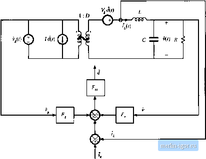 Строительный блокнот Introduction to electronics Fig, 12,23 Accuraw aeterminwitin of the Telalionship between the average inductor current and rrtT, ![]() JO Tills is the more accurate relationship which is employed in this section. A small-signal current programmed controller model is found by perturbation and linearization of Eq.( 12.59). Let (i..ft )),] = /, 4, d(t) = D + d{!) miO) = Mi+mi(0 Mij(:t)=Mj-i-ni,(r) (12.60) Note that it is necessary to perturb the slopes rn and trt since the inductor current slope depends ou the converter voltages according to Eq. (i2.!). For the basic buck, boost, and buck-boost converters, the slope variations are given by Buck converter Boost converter ra, = (12.61) Buck-boost converter ii=X h is assumed that m does not vary: /м, = M. Substitution of Eq, (12.60) into Eq. (12.59) leads to [/L+*JO) = (/. + r,(t))-M,J.JD-Kf(o}-+/?i,(0}(f> + f(f))-y(jW2 + u,(I))(d-(()) -S The fnst-otder ac terms ate TiCr) = t%(!) - [iWX + D*f 1- 0М{Г,у{г) - Й,(0- mW f-3) With use of the equilibrium relationship PM = DMj, Eq. (12.63) can be further simplified: lble 13,2 Current progmtnnied coiitroilergains for basic conveners
