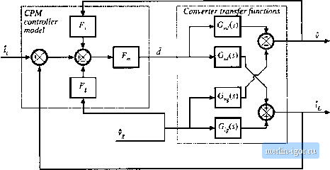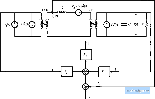Строительный блокнот Introduction to electronics m Boost ![]() (c) Buck-boost ![]() Fig. 11.25 Continued. ![]() Fig. 12.16 Block diagram that models the current-programmed converters of Fig, 12.25. r 1Л - i-i U2.69) Figure 12.26 illustrates replacement of the converter circuit m[>deis of Fig. 12.25 with block diagrams that cotresptuid to Eqs. (12.67) and (12.68). The control-to-output and line-to-output transfer functions tan now be found, by manipulation of the block diagram of Fig. 12.26, or by algebraic elimination of (/and r, from Eqs. (12.66), (12.67), and (12.68), and solution for v. Substitution ofEq. (12.68) iitto Eq. (12.66) and solution for j leads to By substituting this expression into Eq. (12.67), one obtains (l+FG ) I Solutioit of this equatioit for v5 leads to the desired result: (12,70) (12.71) Therefore, the current-prograinined control-to-output transfer ftinction is (12.72) The turrent-programmed liiie-to-witpiit tnmsfer function is --- C12-?3) (12.74) Equations (12.73) and (12.74) are general expressions for the important transfer functions of singie-indtic tor current-programmed converters operating in the continuous conduction mode. 12.3.3 Discussion The controller inodel ofEq. (12.Й6) and Fig. 12.24 accounts for the differeitces between and that arise by two mechanisms: the inductorcurrent ripple and the artificial ramp. The inductorcurrent ripple causes the peak and average values ofthe inductor current to differ; this leads to a deviation between the average inductor current and i. Since the magnittide of the inductor current ripple is a function of the converter input and capacitor voltages, this mechanism introduces v, and v dependencies into the contrt)i-ler smaii-signai block diagram. Thus, the and gain bKx;ks of Fig. 12.24 model the small-signal effects of the inductor current ripple. For operation deep in continuous conduction imxle {lURT э> 1), the inductor current ripple is small. The and F, gain bloclcs can then be ignored, and the inductor current ripple has negligible effect on the current programmed controller gain. The artificial ramp ai.so causes the average inductorcurrent to differ from t. This is mtxleled by the gain bkxk F, , which depends inversely on the artificial ramp slope M. With no artificial ramp, Л/ = 0 and tends to infinity. The current-programmed control systems of Fig. 12.25 then effectively have infinite loop gain. Since the duty cycle is finite, the signal at the input to the F, bkx;l<; (£&f, ) must tend to zero. The bloclc diagram then predicts that f = 0 = -b.-FA-F.S (12.75) In the case of negligible indiictorcurrentrippie {F - * 0 and F -* 0), this equation further reduces to 0 = f,-,\ (12.76) This coincides with the simple approximation employed in Sectitm 12.2. Hence, the transfer functions predicted in this sectitm reduce to the results [)f Sectitm 12.2 when there is no artificial ramp tuid negligible inductor current ripple. In the limit when F, F 0, and F -* 0, the controi-to-output transfer function (12.73) reduces to lim Ga.) = (12.77) and the iine-tti-output transfer functitm reduces to |