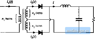 Строительный блокнот Introduction to electronics I4.i Miiltiple-Windiii Manelics Design via itie KMelkod 547 The low-frequency copper loss P in winding 7 depends on the dc resistance Л. of winding j, as follows: P..ii]Pt (i -) The resistance of winding / is (14,25) Avij where p is the wire resistivity, £y is the length of the wire used for winding/, and Ащ is the ctoss-sectionai area ofthe wire used for winding /. These quantities can he expressed as ljHj(MLT) (14.26) A.j = 4f (14,27) where {MLT) is the winding raean-length-per-turn, and /f, is the winding fill factor. Suhstitution of these expressions into Eq. (14.25) leads to The copper loss of winding / is therefore The total copper loss ofthe к windings i.s (14.30) It is desired to choose the such that the total copper loss P j, is minimized. Let us consider what happens when we vary one of the as, say (Xj, between 0and 1. When a, =0, then we allocate zero area to winding 1. In consequence, the resistance of winding 1 tends to infinity. The topper loss of winding 1 also tends to infinity. On the other hand, the other windings are given maximum area, and hence their copper losses can be reduced. Nonetheless, the total copper loss tends to infinity. When a, = l,then we allocate all ofthe window area to winding 1, and none to the other windings. Hence, the resistance of winding 1, as well as its low-frequency copper loss, are minimized. But the copper losses ofthe remaining windings tend to infinity. As illustrated in Fig. 14.8, there must be an optimum value of [ that lies between these two extremes, where the total copper loss is minimized. Let us cotnpute the optimum values of Ci, ctj,ftj using the method of Lagrange tnultipliers. It is desired to tninitnize Eq. (14.30), subject to the cotistraint of Eq. (14.23). Hence, we define the function Copper ![]() Fig. 14.S Variation of copper losses with a[. 1 a, 04.3!) where (14,32) is the constraint that must etjiiai zero, and is the Lagrange multiplier. The optimum point is the solution of the system of equations tfotj 3/(a aj,--,a ) dec. a/(a,.(j;.--.r(.,) (14.33) The solution is p(Mi,T)f. (14.34) (14.35) This is the optimal choice for the as, and theresulting minimum valueof P . According to Eq. (14,22), the winding voltages are proportional to the turns ratios. Hence, we can expiess the a-S in the alternate form (14.36) by multiplying and dividing Eq. (14.35) by tlie quantity V /fi ,. It i.4 irrelevant whether rms or peak volt-age.4 are used. Equation (14.36) is the desired result. Il .states that the window area should be allocated to the various windings in proportion lo their apparent powers. The numerator of Eq. (14.36) is the apparent power of winding m, equal lo the product of the rms current and the voltage. The denominator is the sum of the apparent powers of all windings. As an exaraple. consider the PWM full-bridge transforraer having a center-tapped secondaty. as illustrated in Fig. 14.9. This can be viewed as a three-win ding transformer, having a single primary-side winding of turns, and two secondary-side windings, each of n, turns. The winding current waveforms !j(f), iit), and 1з(() are iilnstrated in Fig. 14.10. Tlieir rms values are (14.37) (14,38) Substitution of these expressions into Eq. (14.35) yields - I .tt7t V £}- (14.39) (14.40) If the design is to be optimized at the operating point D - 0.15, then one obtains a, = 0396 2 = 0,302 a, = 0,302 (14.41) So appToxiraateiy 40% of the window area should be allocated to the priraary winding, and 30% should ![]() Fig, 14,9 PWM full-bridge transformer example. |
