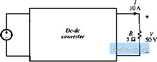 Строительный блокнот Introduction to electronics ![]() 100 V Fig. 1.6 Л simple power processing exsimple: cOnsti uction of a 5Ю W Uc-dc Cunverter, ![]() p=1000W 100 V ! + sov Linear amplifier and tiase driver P = 500W 10 A V 50 V /*, =1000W ------------------------ P , = 500W Fig. 1.7 Changing the dc voltage via disslpntivc means: <a) voltage JiviJer, (b) aeries puss rsrgiilator variable resistor, whose value is adjusted such that the required output voltage is obtained. The load current flows through the variable resistor. R)r the specified voltage and current levels, the power P/ dissipated in the variable resistor equals the load power - 500 W. The source V, supplies power = iOOO W. Figure 1.7(b) illustrates a more practical implementation known as the linear series-pass regulator The variable resistor of Fig. 1.7(a) is replaced by a linear-mode power transistor, whose base current is controlled by a feedback system such that the desired output voltage is obtained. The power dissipated by the linear-mode transistor of Fig. l,7(b) is approximately the same as the 5(X)W lost by the variable resistor in Fig. i.7(a). Series-pass linear regulators generally find modern application only at low power levels of a few watts. Figure 1.8 illustrates another approach. A single-pole double-throw (SPDT) switch is connected as shown. The switch output voltage vjt) is equal to the converter input voltage V, when the switch is in position 1, and is equal to zero when the switch is in position 2. The switch position is varied periodically, as illustrated in Fig. 1.9, such that vj,t) is a rectangular waveform having frequencyand period T, = l/f, The duty cycle D is defined as the fraction of time in which the switch occupies position 1. Hence, 0< D< 1. In practice, the SPDT switch is realized using switched-mode seiniconductordevices. J.J Introduclionlo Power Processing ![]() Kig. 1.8 liLstrtiuri (if SPDT switch wliicli chiinge-s the dc compancnt of tile voltage. switch position: ] Kig. I.S Swiieh output vol [age waveform v[l). ![]() which are controlled such that the SFDT switching function is attained. The switch changes the dc component of the voltage. Recall from Fourier analysis that the dc contponent of a periodic waveform is equal to its average value. Hence, the dc component of is vJt)dt = DV, (1.3) Thus, the switch changes the dc voltage, by a factor eqital to the ditty cycle D. To convert the input voltage V, = 100 V into the desired output voltage of V= 50 V, a duty cycle of Z) = 0.5 is required. Again, the power dissipated by the switch is ideally zero. When the switch contacts are closed, then their vt)ltage is zero and hence the power dissipation is zero. When the switch contacts are open, then the current is zero and again the power dissipation is zero. So we have succeeded in changing the dc voltage component, using a device that is ideally lossless. In addition to the desired dc component V,.. the switch output voltage waveform also contains undesirable harmonics of the switching frequency. In most applications, these harmonics must be removed, such that the output voltage v(0 is essentially equal to the dc component V =V, \ low-pass filter can be employed for this purpose. Figure 1.10 illustrates the introduction of a single-section L-Clow-pass filter. If the filter corner frequencyis sufficiently less than the switching frequency then the filter essentially passes only the dc component of v,(f). To the extent that the switch, inductor, and capacitor elements are ideal, the efficiency of this dc-dc converter can approach 1Ш%. In Fig. 1.11, a control system is introduced for regulation of the output voltage. Since the output voltage is a function of the switch duty cycle, a control system can be ct)nstructed that varies the duty cycle to cause the output voltage to follow a given reference. Figure 1.11 also illustrates a typical way in which the SPOT switch is realized using switched-mode semiconductor devices. The converter power stage developed in Figs. 1.8 to 1.11 is called the buck convener. Ьесаи.че it reduces the dc voltage. Converters can be constructed that perform other power processing functions. For example. Fig. InlTodinctkin 100 V 1 \i Vh ТЛЛГ L f КО small F4g. 1.1(1 Addition of L-C low-pass filter, for lenioval of switcliiiig linrmouics. Power Switching converter Load input 500 W 1£. ТПЛР Transistor gate driver star 1 iver i-A Error signal 5(1)*