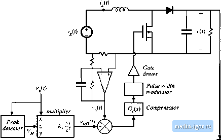 Строительный блокнот Introduction to electronics ![]() Fig, 18,14 Average current eniitn)! incorporatitig input voltage leodlorward, line vollage. A disadvantage is the ac line current distortion introduced by variations in the vollage produced by the peak detector. To aid in the design of the inner feedback loop that controls the ac line currenl waveshape, a converter model is needed that describes how the cttnverler average inpul current depends on the duty cycle. We would prefer to apply the avetaged small-signal modeling techniques of Chapter 7 here. The probiem is that the variations in the duty cycle d{j\, as well as in the ac input voltage v(f) and current are not smaii. As a resuit, in general the stnaii-signal assutnptions are violated, and we aie laced with the design of acontrol system lhal exhibits significant nonlinear lime-varying behavior, When the rectifier operates near periodic steady slate, the output voitage i(f) of a weli-designed system exhibits small variations. So we can write (vW) I + vtf) wilh ад :! (18..>2) In odier words, the small-signal assumption continues to be valid with respect to the rectifier output voltage. In the case of the boost converter, this allows us to linearize the converter inpul characteristics. Following the approach of Chapter 7, we can express the average inductor vollage of the boo.st converter as Fig. 18.15 Linearized inodel describing the boost [;onverter inptit eharacteristics, corresponding to Eq. (18.55) ![]() I- -l = (V>) -(0(v(r)}, (1S.53) This equation contains the nonlinear term d{t) (i(r)),.. Substitution of Ecj. (18.51) into (18.53) yields L / = {v,(f)) - dXt] V-d!U)m (tK.54) When Eq. (18.52) is satisfied, dien the nonlinear tertrt - d{t)v{t) is much smaller in magnitude than the linear term - (f(f)K Therefore, we can discard the nonlinear tenn to obtain dhit)) Lj{,{t))..-tl4,)V (18.55) This linear differentia] equation is valid even though i,(0, v,((), and dif) contain large variations. An equivalent circuit corresponding to Eq. (18.55) is given in Fig. 18.15. The averaged control-to-input-curieiit transfer function is found by setting the independent inputs other than dif) to zero, and then solving for i; the model predicts that tliis transfer function is dis) V sL (IS.56) where i(s) is the Laplace transform of (/(f)). So the input characteristics of the boost rectifier can be linearized, even though the nc input variations are not small. Unfortunately, Eq. (18.52) is not sufficient to linearize the equations describing the input characteristics of the buck-boo.st, SEPJC, Cuk, and most other single-phase rectifiers. The ctintrol systern design engineer must then deal with a truly nonlinear time-varying dynamical .system. One approach that is sometimes suggested employs the quasi-static approximation [34.35]. It is asstimed that the ac line variatitins are much slower than the rectifier system dynamics, such that the rectifier always operates near equilibrium. The quiescent operating point changes slowly along the input sinusoid; an equilibrium analysis can be performed to find expressions for the slowly-varying equilibrium duty ratio and converter voltages and curtents. The small-signal dc-dc converter tr;msfer functions derived in Chapters 7 and 8 are evaluated using this time-vaiying operating point. The conveiter poles, zeroes, and gains are found to vaty along the ac input sinusoid. An average curtent controller is designed using these time-varying transfer ftinctions, such that the current loop gain has a positive phase margin al ail operating points. We expect that the quasi-static approximation should lie valid if the rectifier system dynamics are sufficiently fast, and it is reasonable to anticipate Lhat high-frequency PWM converters have dynnin- ICS lhai are much faster than the ac line ftecjuency. The problem is that no good condition on system parameters, which can justify the approximation, is known lor the basic converter topologies. There is room for additional research in this area. It is well-understood in the field of control systems that, when the rectifier system dynamics are not sufficiently fast, the quasi-static approximation yields neither sufficient nor necessary conditions for stability of the resulting design. Time-varying loop gains that always have a positive phase margin may nonetheless be unstable, and a negative phase margin does not always imply instability. Such phenomena are sometimes observed in rectifier systems. Even worse, it is difficult to justify the use of the Laplace transform on rectifiers described by time-varying differential equations, unless the quasi-static approximation can be validated. 18.3,2 Current Programmed Control Another well-known approach to attaining input resistor emulation is the use of cuirent-programmed control. As illusuated in Fig. 18.16, the programmed cuirent /ДО is madeproportional to the ac input voltage. This causes the average inductor cunent, and hence also ((O),-. to approximately follow v{i}. As in average current control, a multipliei is u.ied to adjust the emulated resistance and average power flow; the control signal c , ,(i) is typically used to stabilize the dc output voltage magnitude. Several rectifier control iCs aie commercially available, which implement current-programmed control. As discussed in Chapter i 2, several mechanisms cause the average inductor current and hence also {!j,(f))); to differ from the programmed ij,f). These mechanisms introduce crossover distortion and line current haimonics. An aitificial ramp having sufficiently large slope wt is necessary to stabilize the Boost converter сгиЛпЛ V/t) Multiplier 1*2(0 ,(0 v{t) < R ijf) Clock <1 T fCO Corjtparaior S Q R Ijitch Carrctit-progratntned controller Fig. 18.16 Currem-progiiiinmed coutinl of a boost j-cttiiJcr. |
