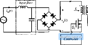 with tlic ac inptit voltages given by Eq. (18.150). The input filter has negligible effeci of the low-frequency components of the converter waveforms. Determine the steady-state dc output voltage V, as a ftiiictioii of V, l\, and ф. (e) Efcienntnc the power factor. You may assuine that the input filter completely removes the switching harmonics from the cun-ents ( (/), iU). and iit). However, the input fdter elements consume or supply negligible line-frequency reactive power, 18.9 In the three-phttsc DCM flyback rectifter of Fig. 18.45, the hiput Filter htts negligible effect on the low-frequency components of the input ac waveforms. The transistor operates whh switching frequency and duty cycle d. Flyback transformers Tj, Tj.and T, each have magnotiziiig tiiductanee L referred to the primary, tunis ratio n : I, and have negligible leakage inductances. dc ир<и taput filler iTJWv Fig. 18.45 Isolated 30ac-dc rectifier ba.sed on the flyback cotiverter operating in discontinuous conduction mode: Protilein 18.9. (a) Determine expressions for the low-frequency componeiits of the ac input and dc output eurrcnts. (b) Derive an averaged equivalent circuit inodel for tho converter, and give expressions for the eie- Problems ment values. (e) Derive the eonditious for operation in the discotitiuuou.s conduction mode. 18.10 Power stage design of a universal-input boost rectifier. Tlie objective of thi.4 problem is to woik out the power .stage design of a low harmonic rectifier based on the boost conveiter. This conveiter is to be designed to operate anywhere in the world, and hence the input voltage may vary over the range 90 to 270 Vrms, 50 to 60 Hz. The converter produces a regulated 385 V dc otitput, at 1000 W. The .4w-itching frequency/, is 100 kHz. You may assume that the controller operates peifectly, to produce an undistorted ac line cuirent waveform and a well-regnlated dc ontput voltage. (a) Derive an expression for how the duty cycle d(t) will vaty over the ac line cycle. You may neglect converter dynamics and losses. Sketch rf(t) under condition.? of maximum and minimum ac line voltage. (b) Specify the inductor: (i) Specify the value of L such that, at the peak of the sinusoidal input voltage, and under worst-case conditions, the inductor cuiTCiit ripple Ы. is IWc of the instantaneous low frequency current i,(0. (ij) Specify the wor.st-case values of the peak and rms inductor current, assuming 100% efficiency. (c) Determine the worst-case ims currents of the MOSFET and diode, assuming 100% efficiency. (d) Specify the value of С that leads to a worst-case low-frequency (-c/J output voltage peak-peak ripple of 5 V. (e) Given the following loss elements Inductor winding resistance 0.1 ii MOSFET on-resistance 0.4 Ii Diode forward voltage drop 1.5 V Switching loss: model as 1,(0(0.25 Q.) For a constant 1000 W load, and assuming that the controller operates perfectly as described above, find the rectifier efficiency (i) at an ac input voltage of 90 V rms (ti) at an ac input voltage of 270 V rms 18.11 The flyback converter shown in Fig. 18.46 operates iu the continuous conduction mode. The MOSFET I-И- ![]() Fig, 18,46 l,ow4tarmonic rectifier sy.stem based on tlie CCM flyback converter, Problem 18.11. has on-resistance K .and diode D, has a constant forward voltage drop Уц. k\\ other loss elements can |