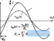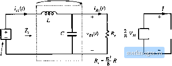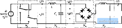 Строительный блокнот Introduction to electronics quency is и/, rattier liian Tiie arguments used to model the tank and rectifier/filter networks are imehanged from Section 19.1. The rectifier presents an effective resistive load to the tank, ofvalue R, = ВЛ/тг In consequence, the converter dc conversion ratio is given by 1 = = (19.21) This is a good approximation provided that rtf is close to and that is sufficiently large. Typical characteristics are sketched in Fig. 19.18. The series resonant converter is not generally designed to operate in a subharmonic mode, since the fundamental modes yield greater output voltage and power, and hence higher efficiency. Nonetheless, the system designer should be aware of their existence, because inadvertent operation in these modes can lead to large signal instabilities. 19.2.3 Parallel Resonant DC-DC Converter Example The parallel resonant dc~dc converter is diagrammed in Fig. 19.19. It differs from the series resonant converter in two ways. First, the tank capacitor appears in parallel with the rectifier network rather than in series: this causes the tank transfer function His) to have a different form. Second, the rectifier drives an inductive-input low-pass filter. In consequence, the value of the effective resistance R differs from that of the rectifier with acapacitive filter. Nonetheless, sinusoidal approximations can be used to understand the operation of the parallel resonant converter, As in the series resonant converter, the switch network is controlled to produce a square wave f,(f). If the tank network responds primarily to the fundamental component of i>,(t), then arguments identical to those of Section 19.1 can be used to model the output fundamental components and input dc components of the switch waveforms. The resulting equivalent circuit is identical to Fig. 19.9. The uncontrolled rectifier with inductive filter network can be described using the dual of the arguments of Section 19.1.2. In the parallel resonant converter, the output rectifiers are driven by the nearly sinusoidal tank capacitor voltage l;(t), and the diode rectifiers switch when (0 passes through zero as in Fig. 19.20. If the filter inductor current ripple is small, then in steady-state the filter inductor current is essentially equal to the dc load current /. The rectifier input current ((t) is therefore a square wave of amplitude /, and is in phase with the tank capacitor voltage Vp(f); ![]() Swildi networii Resonant lanic nerworii Rectifier network Low-pass filter dc nenvorlc load Fig. 19.19 Block diagram uf the parallel resnnant converter fundamental ![]() Fig. 1! .2() Rectilier network input terminal wuveforms, fur the parallel resnnant converter; (a) uctaal waveforms v (/) and r((), (b) fundamental coniponents v,(() and 1/(1). =1,1,-1, v/here (p is the phase shift of ICO- The fundamental component of ig{l) is i*a(0 = shi (ш.;-ф ) {19.23) Hence, the rectifier again presents an effective resistive load to the tanlc circuit, etjual to (19.24) The ac components of the rectified tanlt capacitor voltage I Vfflj} I are removed by the output low pass filter. In steady state, the output voltage Vis equal to the dc component of v(() : sill (B,( -фя) (19.25) (14,22) Fiy. 19.21 An ecjuivalent circuit for the rectifier and inductive filter network nf ihe parullel resonant converter, whitb models tbe fundamental components of the rectifier ac Input ftivcforms and the dc components of the load waveforms. So the k)ad voltage V and the tank capacitor voltage amplitude are directly related in steady state. Substitution ofEq. (19.25) and resistive load characteristics V= [R into Et]. (19.24) yields: Л = /г= 1.23Э7Я (19.26) An equivalem circuit for the uncontrolled rectifier with inductive filter network is given in Fig. 19.21. This model is similar to the one used for the series resonant converter. Fig. 19.12, except that the roles ofthe rectifier input voltage v(/) and current if.it) are ititettbanged, and the effective resistance R has a different value. The model for the complete converter is given in Fig. 19.22. Solution of Fig. 19.22 yields the converter dc conversion ratio: Transfer function H(,s) ![]() 1 $R 21 -- cos (Ф ) 4V Parallel tank network Fig, 19,22 Equivalent cliruit for the p ra?lcl resonant converter, which models the fundamental components of the lank wavefonns, and ttie dc components of the converter input current and output voltage. (19.27) where His) is the tank transferfunction m,s) (19.28) Z (i).vi (19.29) The Bode magnitude diagrams of H(s) and are constructed in Fig. 19.23, using the graphical construction method of Chapter 8. The impedance Zs) is the parallel combination of the impedances of the tank inductor!, capacitor C, and effective load Я.ТЬе magnitude asymptote of the parallel combination of these components, at a given frequency, is equal to the smallest of the individual asymptotes tiiL, 1/юС, and R. Hence, at loW frequency where the inductor impedance dominates the parallel combination, Ij Z(j) II = taZ., while at high frequency the capacitor dominates and Z (j) = 1/tijC, At resonance, the impedances of the inductor and capacitor are equal in tnagnitude but opposite in phase, so that their effects cancel. The impedance Z(i) is then equal to R: +jis>nC- (19.30) with The dc conversion ratio is therefore |