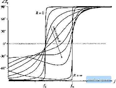 Hg. 19.JS ZCS/ZVS boiindaiy. LCC inverter example: (a) variatioit ttf tank network input impedaiKe phase shifl with load resistance, (b) Comparison оГД with matchtddoati impedance [. Use ofEq. (19.58) to eliminate Z, from Eq. (19.57) leads to zl< ((9.59) This is tlie desired result. Thequantity Z is the inverter output impedanee, and Й = eonesponds to operation at matched load with maximum output power. The impedances Z,- and Zj, aie purely imaginary, atid hence Eq. (19.59) has nt) real stilutitm unle.ss Z and Z are [)foppo.site phase. As illustrated in Fig. 19.37, if at a given frequency Z and Zjq are both inductive, then zero-voltage switching occurs for all loads. Zero-current switching occurs for all loads when Z- and Z-j, iire both capacitive. Therefore, Theorem 2 is proved. Figure 19.38(ii) illustrates the phase response of Z/jm) as R varies from 0 to for the LCC inverter. A typiciil dependence of Л., and the matched-load impedance Z ottm frequency is illustriited in Fig. 19.38(b). Zero-voitiige switching occurs for all loads when / >/ , imd zero-current switching occurs for all loads when /</o. Over the range/ц < f<f , Z;o is inductive while Z.is ciipiicitive; hence, zero-voitage switching occurs for R < Д.;, while zero-current switching occurs for R > /f,-,. At frequency /m crii = ii il hence the ZVS/ZCS boundary is encountered exactiy at matched loiid. It is commonly desired to obtain zero-voitiige switching at matched load, with low circulating currents and gtKxl efficiency at light loiid. It is apparent that this requires operation in the range/g </</ ,. Zero-voitage switching will then be obtained under matched-ioiid and short-circuit conditions, but will be lost at light load. The choice of element values such that Zq -s: Z is iidvantageous in that the range of loads leading to zero-voitage switching is maximized. 19.4.4 Another Example As a final example, let us consider selection ofthe resonant tank elements to obtain a given output characteristic iU a certain switching frequency, iind lets eviduate the effect of this choice onfi.,;. It is desired to operate a resonant inverter at switching frequency /, = 100 kHz, with an input voltage of = 160 V. The ct)nverter should be capable of producing an open-circuit peak output voitiige 1. = 4(X) V, and should also produce a nominal tiutput [)f 150 Vrms at 25 W. tt is desired to select resonant tank elements thiit accomplish this. Tbe specificiitions imply that the converter should exhibit an open-circuit transfer function of , , V (400 V) \Hjj)\ = j\--f=l,96 (19,60) The required short-circuit current is found by solving Eq. (19.42) tbr l.. vT (19.61) The specifications also imply that the peak voltage and current at the nominal operating point are Substitution of Eq. (19.62) itUo Eq. (19.61) yields [0.236 a1 212 v = 0.27SA 1400 v IVIiitclied load therefore oteurs at the operating point (19,63) (19.63) К. = - = 283У и, = ; = 0.27ЛА Z,(M)=y=l 9Q (19,64) Let us select the values of the tatik elements in the LCC tatik network illustrated in Fig. 19.39(a). The impedances of the .series and parallel branches can be represented using the reactances X. and illustrated in Fig. 19.39(b), with (U,C, The transfer function HJJdiJ is given by the vohage divider formtila The output impedance Zjijtii) is given by the parallel combination (19.65) (19.66) ТППГ Fig. 19.39 Tnk network of the LCC inverter example; (a) schematic, (b) repre.4etttatioti of series and parallel branches by reactances X. and X, |