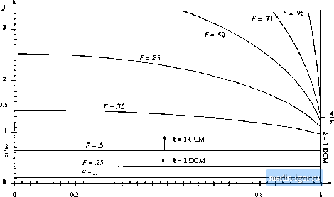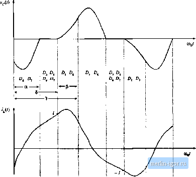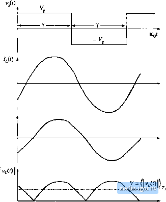 Строительный блокнот Introduction to electronics F= 1.0 ![]() 0.4 0.6 Fig. 19.48 OLitpui diaractcristics, t. = 1 CCM. к = 1 DCM. and A = 2 DCM (below resonance). 19.5.2 Parallel Resonant Converter For operation in llie frequency range 0,5/g </, < =o, the parallel re.sonant dc~dc converter exhibits one continuous conduction mode and one di.scontinuous conduction mode. Typical CCM switch voltage v,{i), tank inductor current/О), and tank capacitor voltage fO waveforms are iilu.strated in Fig. 19.49. The CCM converler output chatacteri.stics are given by sin (Ф) (19.92)