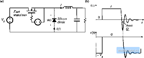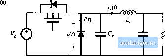 Строительный блокнот Introduction to electronics 20.1 Sofi-Swilcking Mechiisnis of Semkoiidtjctor Devices 763 ![]() Fig. 20.1 Hard switching at the tum-oFT transition of щ diode, conventional buck converter exatnple: (a) schematic, (b) diode voltage and current waveforms. 20.1.1 Diiide Switching As discussed in Chapter 4, the reverse-recovery process usually leads to significant switching loss associated with the turn-()lT transititm of diodes. This is often the largest single stiurce oi loss in a hard-switched converter. Normally, negligible hm is associated wilh the turn-on transition of pimer diiides. Three types of diode tiu-n-olf transition waveforms are commonly encountered in modern switching converters: hard Switching, zero-current swhching, and zero-voltage switching. Figure 20.1 illuslrales a conventitinal hard-switched PWM buck converter. The diode voltage and current wavelbrms v(/) and /(r) are also illustraled, wilh an exaggerated reverse recovery time. The (lutpul inductor current ripple is small. The ditide turns tilT when the transistor is turned on; the reverse recovery process leads to a negative petik current of large amplitude. The diode must immediately support the full reverse volttige V, Eind hence both v(t) and i(t) must change with large slopes during reverse recovery. As described in Section 4.3.2, hard switching of the diode induces energy loss in the transistor, given approximately by {20.1) where gis the diode recovered charge and (is the reverse recovery time, both taken to be positive quantities. The recovered chtirge is relatively large because the slope di/dt is large during the turn-off transition. The resonant circuii formed by the diode tiulput capacitance Cj and the diode package and other wiring inductances letids to ringing at the end ofthe reverse recovery time. Figure 20.2 illustrates zero-current switching at the turn-olTlransitionofadiode. The converter example is a quasi-resonant zero-voltage switching buck converter (see Section 20.3.1). The outpul inductor current ripple is again small. However, tankinducltir L,. is now ctmnected in series wilh the diode. The resulting ditide current waveform changes with a limited skipe as shown. The diode reverse-recovery process commences when ((f) passes through zero and becomes negative. The negative i{t) actively removes stored charge from the diode; during this reverse recovery time, the diode remains forward-biased. When the stored charge is removed, then the diode voltage must rapidly change to - V. As de.scribed in Section 4.3.3, energy Wjis stored in inductor at the end ofthe reverse recovery dme, given by Soft Swilching ((() Ф T - >iCO ![]() Vlrea i 2. Fig, 20.2 Zero-current switching at tlte turn-otT transition of a diode, ZVS quasi-resonant Ъпск converter example: (a) converter scliematic, (b) diode voltage and current wavefonns. (20.2) The resonant circuit formed by and tlie diode outputcapacitance Cj then cause this energy to be circulated between and t.y. This energy is eventually dissipated by parasitic resistive elements in the circuit, and hence is lost. Since Eqs. (20.1) and (20.2) are similar itt fonn, the switching losses induced by the reverse-recovery processes of diodes operating with hard switching and with zero-current switching are similar in magnitude. Zero-current switching may lead to somewhat lower loss because the reduced di/dt leads to less recovered charge Q. Zero-current switching of diodes also typically leads to increased peak inverse diode voltage during the ringing of and C,., because of the relatively large value of L. When a diode operates with hard switching or zero-current switching, and when substantial inductance is present in series with the diode, then significant ringing is observed in the diode voltage waveform. A resonant circuit, comprised of the series inductance and the diode output capacitance, is excited by the diode reverse recovery process, and the resulting ringing voltage can be of large enough magnitude to lead to breakdowit and failure of the diode. A common example is the diodes on the secondary side of a hard-switched transformer-isolated converter; the resonant circuit is then formed by the transformer leakage inductance and the diode output capacitance. Other examples are the circuits of Figs. 20.2 and 20.36, in which the series inductance is a discrete tank inductor. A simple snubber circuit that is often used to protect the diode from excessive reverse voltage is Fig, 20,3 A dissipative suubber circuit, for protection of a diode from excessive voltage caused by ringing. -nsrsv Series inductance R ЛЛг- Diode output capacitance Snubber circuit Tank circuit Fig. 20,4 Zeru-vdltage switching at the turn-off transition of a diode, ZVS qtjasi-squarewavc buck converter example: (a) converter schematic, (b) diode current and voltage wavefonns. ![]()