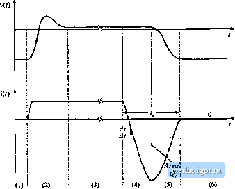 Строительный блокнот Introduction to electronics Fig. 4.2S Diode voltage and turrcnt waveforms. Interval (1): off state. Interval (2): turn-on transition. Interval (3): on state. Iniervals (4) and (5): lutn-off transition. Interval (6): otf state. ![]() istic of the p-n diocie is an et]iiilibritjm relatit)n. During transients, significant deviations from the exponential characteristic are observed; these deviations are associated with changes in the stored minority charge. As illustrated in Fig. 4.25, the diode operates in the off state during interval (1), with zero current and negative voltage. At the beginning of interval (2), the current increases to some positive value. This current charges the effective capacitance t)f the reverse-biased diode, supplying charge to the depletion regjon and increasing the voltage v(t). Eventually, the voltage becomes positive, and the diode junction becomes forward-biased. The voltage may rise to a peak value of several volts, or even several tens of volts, reflecting the somewhat large resistance of the lightly doped iC region. The forward-biased junction continues to inject minority charge into the n~ region. As the total minority charge in the n regit)n increases, conductivity modtilation t)fthe n~ region causes its effective resistance to decrease, and hence the ft)rward vt)ltage drop \it) also decrea.ses. Eventually, the diode reaches equilibrium, in which the minority carrier injection rate and recombination rate are equal. During interval (3), the diode operates in the on state, with forward voltage drop given by the diode static i-v characteristic. The turn-off transient is initiated at the beginning of interval (4), The diode remains forward-biased while minority charge is present in the vicinity of the diode junction. Reduction of the stored minority charge can be accomplished either by active means, via negative terminal titrrent, or by passive means, via recombination. Normally, both mechanisms occur simultaneously. The charge 2contained in the negative portion of the diode titrn-off current waveform is called the recovered charge. The portion of Qr occurring during interval (4) is actively-removed minority charge. At the end of interval (4), the stored minority charge in the vicinity of the fJ-f) jtmction has been removed, such that the d[t)de junction becomes reverse-biased and is able to block negative voltage. The depletion region effective capacitance is then charged during interval (5) to the negative off-state voltage. The portion of Q, occitrring during interval (5) is charge supplied to the depletit)n region, as well as minority charge that is acdvely retuoved from remote areas of the dit)de. At the end of interval (5), the diode is able to block the entire applied reverse vt)ltage. The length t)f intervals (4) and (5) is called the reverse recover) time t. During interval (6), the diode operates in the off state. The diode turn-off transition, and its inflitence on switching loss in a PWM converter, is discussed further in Section 4.3.2. ТаЫс 4-1 Charat;Len4tics of several eommertjiiil power rectifier dindes