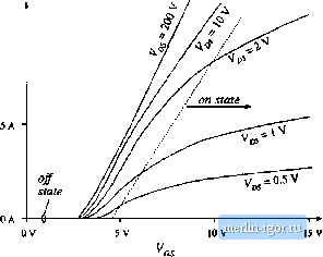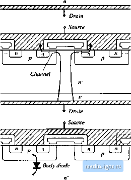 Depletion rtgion Fig. 4.27 Operation of the [sowei-MOSFFT: <a) in tlie off state, f, appears across the depletion region in tlie n~ region; (Ъ) curreiil flinv thnjngli the conducting channel in the on state; (c) body diode due to the f)-M junction. ![]() Draifi /д. The MOSFET is able to conduct peak currents well in excess of its average current rating, and tlie nature of tlie static characteristics is unclianged at high current levels. Logic-level power MOSFETs are also available, which operate in the on state with a gate-to-source voltage t)f 5 V. A few/-channel devices can be obtained, but their properties are inferior to those of equivalent n-channel devices. The on-iesistauce and forward voltage drop of the MOSFET have a positive temperature coefficient. This property makes it relatively easy to parallel devices. High current MOSFET modules are available, containing several parallel-connect chips. The major capacitances of the MOSFET are illustrated in Fig. 4.29. This model is sufficient for ША - Fig. 4.28 Typical static charatiCTistits of a power MOSFET, Dniin current i is plotted vs. gate-to-.чоигсе voltiige Vg-, for various values of draiii-to-source voltage ![]() qualitative understantiing of the MOSFET switching behavior; more accurate models account for the parasitic junction field-effect transistor inherent in the DMOS geometry. Switching times of the MOSFET are determined essentially by the times required for the gate driver to charge these capacitances. Since the drain current is a function of the gate-to-soiirce voltage, the rate at which the drain current changes is dependent on the rate at w hich the gate-to-soitrce capacitance is charged by the gate drive circuit. Likewise, the rate at which the drain voltage changes is a function of the rate at which the gate-to-drain capacitance is charged. The drain-to-source capacitance leads directly to switching loss in PWM conveitet.4, since the energy .stored in this capacitance is lost during the transi.stor turn-on transition. Switchitig loss is discussed in Section 4.3. The gate-to-source capacitance is essentially linear. However, the drain-to-soitrce and gate-to-drain capacitances are strongly nonlinear: these incremental capacitances vary as the inverse square root of the applied capacitor voltage. For example, the dependence of the incremental drain-to-source capacitance can be written in the form (4.4) where and Vg are constants that depend on the constritction of the device. These capacitances can easily vary by several orders of magnitude as f. varies over its nortnal operating range. For v. Vf Eq. Fig. 4.2il MOSFET equivalent circuit which accounts for the liody diode and effective termitial capacitances. Table 4.2 Charuderi.stics of several commercial /i-cliattncl power MOSFETa