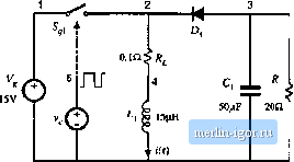 Строительный блокнот Introduction to electronics Rg, B.6 Butk-boost converter example. Switch necwoiH l5riH 50jlF within specifications or to niaketlesign mollifications to retiuce the stresses. In these examples, transient simulations can 1зе used to test for converter responses. Transient simulations can 1зе performed on the converter switching circuit model or on the converter averaged circuit model. As an example, let us apply these two approaches to investigate a start-up transient response of the buck-b )st converter shown in Fig. B.6. Figure B.7 shows a switching circuit mtxlel of the buck-boost converter. The inductor winding resistance R is included to mtxlel the inductor copper losses. The MOSFET is modeled as a voltage-controlled switch controlled by a pulsating voltage source v.. The switch .mtxlel line specifies the switch on-reststance = 50 mil, and the switch off-resistance R = 10 M£2. The switch is on when the controlling voltage is greater than V, = 6 V, and off when the controlling voltage v. is less than V = 4V. The pulsating source has the pulse amplitude equal to 10 V. The period is T. = Uf = 10 fls, the rise and fall times are = tf = 100 ns, and the pulse width is t = 7.9 s. The switch duty cycle is D = (fp + 0.5((+ tj))/Tj.-(i.&. The built-in nonlinear Spice model is used for the diode. In the diode .model statement, only the parameteris specified, to set the forward voltage drop across the diode. The switch and the diode models used in this example are very simple. Conduction losses are modeled in a simple manner, and details of complex device behavior during switching transitions are neglected. ![]() v(t) Buek-tjoost cottve/ter; awftctiing clnxilt Vg 1 015V Sql 1 ZSOswtlrti Dt 3 2 diode RL2 4 0,1 Ll 4 015uH ic=0 CI 3 0 50tjFic=0 R 3020 Vc 5 0 pulse +(0 10V Ous 100ГВ tOOrs 7,Эив lOus) .model swrtofi vsvntoh +(Ron=o,05 Roft=10ir>eg Von=6V Voff=4V) .model diode d(ls=19-12) tran 1u 1.2m Om Iu uk: probe .end Fig, B,7 Buck-boost converter simulation example, switching circuit model. CCM2 я 0.05 a V = 0.8V 0.inSRj. SOjiF Buiic-boost converter, averaged circuit .lib svinlch.№ VglOISV Xsviritch 1 2 2 3 5 CCM2 + FWRAMS: Bon=0.05 VD=0,8 R0=0 RL2 4 0.1 L14 016UH tc=0 C13 0 50uFic=0 nsoso Vc5 00.e .Iran lOu 1.2m Om lOu uic .prtAe .ei4l Fig. B.8 Buck-boost cortverter simulation example, averaged circuit model. Therefore, the circuit mtxiel of Fig. B.7 ctinnot be used to examitie switching transitions or to predict switching los.ses in the convetter. Neverthele.4.4, ba.sic switching operation is modeled, and a transient simulatioti c;m be u.4ed to fmd out how the converter wavefonns evolve iti time over many switching cycles. Tratisient sitnulation parameters жи defined by the .tran line: the output time step is 1 (is, the final simulation time is 1.2 tns, the output wavefortns iu-e genettited from the statt of simulation at time equal to zero, iind the tnaxitnutn tillowed time step is 1 14S. The uic ( use initial conditions ) option tells the simulator to .start with all capacitor voltages and inductor currents etjuiil to the specified initial values. For example, ic=(> in the tj line sets the initial inductorcurrent to zero. In Spice, the default initial conditions are always zero, so that ic=0 statements can be omitted. An averaged circuit model of tiie buck-boost converter is .siiowii in Fig. B.8. This circuit mtxiel is obtained by replacing tiie .switch network in the cotiverter of Fig. B.ft by the CCM2 subcircuit. Notice that the circuits and the netlists of Figs. B.7 and Fig. B.S iu-e vety similar. The tmly difference is that the switchitig devices in the cotiverter circuit of Fig. B.7 iire replaced by the CCIVI2 subcircuit Х,н;, in Fig. B.8. Also, the pulsating source v(f) in the switching circuit is replaced by a cotistant voltage .source Vj, equal to the switch duty cycle D = 0.8. The inductor current and the capacitor voitiige waveforms duritig the start-up transient iue shown in Fig. B.9. For compiirisoti, the waveforms obtained by transient simulatioti of tiie switciiiiig convertercircuit shown in Fig. B.7, and by simulation ofthe iiveniged circuit model ofFig. B.8 iue shown. Switching ripples ciin be observed in the wiivefoims obtained by simulation of tiie switching circuit mtxiel. The converter transient response is governed by the cotiverter natural time constants. Since these time constants are much longer than the switching petitxl, the converter stiut-up transient responses in Fig. B.9 take many switching cycles to reiich the steady state, hi the results obtained by simulation of tiie averaged circuit model, tiie switching ripples are removed, but the low-frequency portions of the converter transient responses, which are governed by the natural time constants of the converter network, match very clo.sely the responses obtained by simulation ofthe switching circuit. Based on the results shown in Fig. B.9, we ciin see that converter components iu-e expo.sed to significantly higher current stresses during the stiitt-up transient than during steady state opetiition. The probletn of excessive stresses in the start-up transient is quite typical for switching power convetters. Practical designs usuiilly include a soft-start circuit, where the switch duty cycle i.s slowly incTetrsed Waveform obiained by simulation of the averaged model , Waveform obtained by simulation of the switching circuii model ![]() 1.2 ms ![]() Waveform obtained by simulation of the averaged model Waveform obtained by simulation of the switching circuit model !-1- 0.2 ms 0.4 ms 0.6 ms O.a ms 1 ms 1.2 ms Fig. b.9 Inductor current and output voltage wavefonns obtaitied by transient sitnulation of the switching converter circuit shown in Fig B.7, and by simulation of the averaged circuit model of Fig. b.8 from zero to the steady-slate value to reduce start-up transient stresses. This simulation example illostrates how an averaged circuit model can be used in p