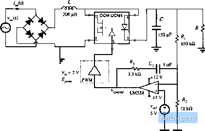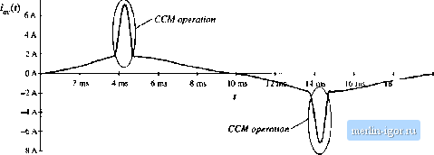 Строительный блокнот Introduction to electronics 120 Vrms 30 Hi ![]() value - {LlMrr(0.5 v, 0.1,0.9)) Fig, B,19 DCM boosl rectifier example. B.2.j Example: DCM BoulsI Rectilier Converters switching at frequencies much above the ac iine frequency can be used to construct near-ideai rectifiers where power is taken from the ac iine without generation of iine current hiumonics. Approaches to construction of iow-harnionic rectifiers are discussed in Chapter IS. One simple solution is based on the boost converter operating in discontinuous conduction mode, as descritied in Section 18.2.1. When a bo[)st DCM convetter operates at a constant switch duty cycle, the input current approxitnately ftiiiows the input voltage. The DCM effective resistance 2L/d (t)T is an approximation [)f the emulated resistance /tj of the DCM boost rectitkr. Ac hne current hatmouics are not zero, but the rectifiercan still be designed to meet harmonic limits. In this section we consider a DCM boost rectifier example and test its petfottnance by simulation. An averaged circuit model of the boost DCM rectifier is shown in Fig. B.l 9. Full-wave rectified 120 Vrms, 50 Hz ac line voltage is applied to the input of the boost conveiter. The converter switches iue replaced by the CCM-DCMl averaged switch subcircuit. It is desired to regulate the dc output voltage at V= 300 V at output power up to = 120W across the load R. The switching frequency is /j. = 100 kHz. Let us select the inductance L so that the converter always operates in DCM. Frotn Eq. (18.24), the condition for DCM is: (B,21) where is the emulated resistance of the rectifier and V is the peak of the ac line voltage. When line 30iV- 3O0V ![]() Fig, B.20 Output vnltitge and ac line ctiirenc in the DCM boost tctiher exatnple. CLittent harmonics and los.ses are neglected, die rectifier emulated resistance at the specified load power P is (B.22) Given V = 170 V and found from Eq. (B.22), Eq. (B.21) gives L < 260 цН, The selected inductance is L = 200 jlH. A low-bandwidth voltage feedback loop is closed around the converter to regulate the dc output voltage. The output voltage is sensed and compared to the reference v. A PI cotnpensator is constructed around the LM324 op-amp. The output v.y; ofthe compensator is the input to the pulse-width tnodulalor. By adjusting the switch duty ratio d, (п,; adjusts the etnuiated resistance = IL/dT of the rectifier, and thereby controls the power taken from the ac line. In steady state, the input power tnatches the output power. The dc output voltage V\s regulated at the value set by the reference voltage v and the voltage divider composed of and follows: (B.23) Modeling ofthe low-bandwidth voltage regulation loop is discussed in Section 18.4.2. It is of interest to find ac line current harmonics. First, a long transient simulation is perfortned to reach steady-state operation. Then, current hartnonics are computed using Fourier analysis applied to the ac line current waveform i (r) during one line cycle in steady state. Figure B.20 shows the steady-state ac line current and output voltage obtained for R - 900 Я, i.e., for KKlWof output power. The output voltage has a dc component equal to 300 V, and an ac ripple component at twice the line frequency. The peak-to-peak voltage ripple at twice the line frequency is approximately S V, which compares well with the value (7 V) found frotn Eq. (18.91). The ac line current has noticeable distortion. The spectrutn ofthe ac line current is shown in Fig. B.21. The largest hartnonic, the third, has an amplitude of 16.6% of the fundamental, and the total htumonic distortion is 16.7%. We can also examine what happens if the rectifier is overloaded. The steady-state ac line current wavefortn ft)r the ca.se when the load resistance is R = 51Ю fl, and the output power is 180 W, is shown in Fig. B.21 S)ectrum of the ac line cuirent in the DCM boost rectifier. SjS. 10 THD = 16.7% 3 i 7 У Harmoitic number 8 Ax THD = 71% ![]() ms 20 ms Fig. B.22 Ac line cuirem of the ЕнСМ boost rectifier example, whcii the output is ovibrloudetf Fig. B.22. The boost converter operates in CCM nenr the peal; of the ac line voitage; this results in current spikes and significant harmonic distortion. CURRENT pro(;rammed control In the current programmed mode (CPM), which is studied in Chapter 12, the transistor switching is controlled so that the peak transistor current follows a control signal. The transistor duty cycle d(t) is not directly contrtilled, but depends on the CPM control input as well as on other ctmverter voltages and currents. Ill this section, large-signal averaged relationships in CPM are written in a form suitable for implementation as asuhcircuit forsimulation, b3.1 Current Programmed Mode Model for Simulation Typical inductor current and voltage waveforms of CPM converters operating in continuous conduction mtxle or in discontinuous conduction mode iue shtiwn in Fig. B.23. Signal i,(f) is the CPM control input. All artificial ramp having slope - ( is added tt) the control input. In the first subinterval, |