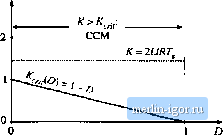 Строительный блокнот Introduction to electronics 5.1 Origin of ihe Dincominnous Condimiati Mode, and Mode boundary Fig, 5.3 Buck converter waveforms at tiie boandary between the contiiiunus and discdntiniious cnnduclion modes: (a) inductor current (b) diode cuiTent i (0. Conducdng devices: ![]() ![]() switching ripple peak amplitude is: (5.2) The ripple magnitude depends on the applied voltage (V - V), on the inductance L and on the transistor conduction time DT, But it does not depend on the load resistance R. The inductor current ripple magnitude varies with the applied voltages rather than the applied currents. Suppose now that the load resistance R is increased, so that the dc load current is decreased. The dc component of inductor current / will then decrease, but the ripple magnitude Дг will remain unchanged. If we continue to increase Д, eventually the point is reached where l-Ai, illustrated in Fig. 5.3. It can be seen that the inductor current iiit) and the diode current tp(0 are both zero at the end of the switching period. Yet the load current is positive and nonzero. What happens if we continue to increase the load resi.stance Л? Tlie diode current cannot be negative; therefore, the diode must become reverse-biased before the end of the switching period. As illustrated in Fig. 5.4, there are now three subintervals during each switching period T. During the first subinterval of lengdi />Г the transistor conducts, and the diode conducts during the second .subinterval of length DjT . At the end of the second subinterval the diode current teaches zero, and for the remainder of the switching period neither the transistor nor the diode conduct. The converter operates in the discontinuous conduction mode. Figure 5.3 suggests a way to find the boundary between the continuous and discontinuous conduction modes. It can be seen that, for this buck converter example, the diode current is positive over the entire Interval ОТ,. < I < T. provided that / > Hence, the conditions for operation in the continuous and discontinuous conduction modes are: Fig. 5.4 Buck converter wuveformi in the discotitiiluiiub; conduction mode: {л) indjctor current (f), (b) diude current Conducting devices: (b) (dC() />di7 tbrCCM l<Ai Гог1Х:М (5.3) vifhere / and are found assuming that the converter operates in the continuous conduction irnxle. Insertion of Eqs. (5.1) and (5.2) into Eq. (5.3) yields the follovifing condition for operation in the discontinuous conduction mode: (5.4) Simplification leads to 2L RT, (5.5) This can also be expressed К < K,.,ID) for DCM (5.6) where 5, / Origin of the Discontiniioiis Condnaion Made, and Made Bamidaiy Fig, 5,5 Rutk toiivcrter K,,(D) vs. o. Tlie converter operates in CCM when К > K,,. and in DCM when К < K,. , 1 D The dimensionless parameter A is a measure of the tendency of a converter to operate in the discontinuous conduction mode. Large values of К lead to continuous mode operation, while small values lead to the discontinuous nitxle for some values of duty cycle. The critical value of Aat the boundary between modes, /i.,.;,(D), is a function of duty cycle, and is equal to iJfor the buck converter. The critical value К.,,ф) is plotted vs. duty cycle D in Fig. 5.5. An arbitrary choice of A is also illustrated. For the values shown, it can be seen that the converter operates in DCM at low duty cycle, and in CCM at high duty cycle. Figure 5.6 illustrates what happens with heavier loading. The load resistance .fi is reduced in value, such that ffis larger If A is greater than one, then the converter operates in the continuous conduction mode for all duty cycles. It is natural to express the mode boundary in terms of the load resistance fi, rather than the diraensionless parameter A. Equation (5.6) can be rearranged to directly expose the dependence of the mode boundary on the load resistance: R < R,rtp) for CCM R > Rcr;,(P} for DCM (5.7) where So the converter enters the discontinuous conduction mode when the load resistance R exceeds the critical value /f.jj. This critical value depends on the inductance, the switching period, and the duty cycle. Note that, since [У < 1, the minimum value of fiif i.T.. Therefore, if Я < Ihen the converter will operate in the continuous conduction mode for all duty cycles. These results can be applied to loads that are not pure linear resistors. An effective load resis- Fig. 5,6 Comparison of К with /, ,(/J), for a larger value of A , Since/C> 1. the converter operates in CCM for all D. ![]() |