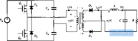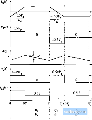 Строительный блокнот Introduction to electronics (6.20) Therefore, it tnu.st be tme that /jjj = /д = 0,5/ duritig the .second subinterval. Iti practice, the ditjde cur-ceitts differ slightly from this residt, because ofthe nonzero magnetizing current. The ideal transfortner currents in Fig, 6.18(b) obey i()-n(D,(0 + Nt () = 0 The node equation at the primary of the ideal transformer is Elimination of i(/) from Eqs. (6.21) and (6.22) leads to (/)-п( 5(() + лги(0=1и() (6,21) (6.22) (6.23) Equations (6.23) and (6.20) describe, in the general case, the transformer winding currents during the second subinterval. According to Eq. (6.23), the magnetizing current ifj,i) may flow through the primary winding, through one ofthe secondary windings, or it may divide between all three of these windings. How the division occurs depends on the i-v characteristics of the conducting transistors and diodes, and on die transformer leakage inductances. In the case where /j = 0, the solution to Eqs. (6.20) and (6.23) is (6.24) Provided that (д /м, then i and i are each approxitnately 0.5i. The next switching period, < ( < 2Г, proceeds in a similar manner, except that the transformer is excited with voltage ofthe opposite polarity. During < f < (Г + DT), transistors Й2 and 63 and diode ZJg conduct. The applied transformer primary voltage is Vj= - V, which causes the magnetizing current to decrease with slope - V,/Ljj. The voltage v,.(r) is equal to nV, and the output inductor current /(;) flows through diode D, Diodes and again both conduct during (T -1- OTf) < t < with operation similar to subinterval 2 described previously. It can be seen that the switching ripple in the output filter elements has freqitency f- UT. However, the transformer waveforms have frequency By application of the principle of inditctor volt-second balance to the magnetizing inductance, the average value ofthe transformer voltage V-j(i) must be zero when the converter operates in steady state. During the first switching period, positive volt-seconds are applied to the transformer, approximately equal to Vj, - Qi and 64 forward voltage drops Qi and conduction time (6.25) During the next switching period, negative volt-seconds are applied to the transformer, given by - - and Q, forward voltage drops and conduction time (6.26) The net voh-secoiids, (hat is, the sura of Ец.ч. (6.25) and (6.26), .should equal zero. While the full bridge scheme cau.ses this tu be approximately true, in practice there exist imbalances such as small differences in the transistor forward voltage drops or in the transistor switching times, so thatvy) is small but nonzero. In conseqtience, dming every two switching periods there is a net inctease in the magnitude of the magnetizing current. This increase can cause the transistor forward voltage drops to change such that small imbalances are compensated. However, if the imbalances are too large, then the magnetizing current becomes large enough to saturate the transforiner. Transformer saturation under steady-state conditions can be avoided by placing a capacitor in series with the transformer priinary. Imbalances then induce a dc voltage coinponent across the capacitor, rather than across the transformer primary. Another solution is the use of current-programmed control, discussed in a later chapter. Tlte series capacitor is omitted when curreiit-prograinmed control is used. By application of the principle of volt-second balance to the output fdter inductor L, the dc load voltage must be equal to the dc component of v,(r); V = {v) (6.27) By inspection of the vjj) waveform in Fig. 6.19, (f,) = 4DV. Hence, V = nDV (6.2a) So as in the buck converter, the output voltage can be controlled by variation of the transistor duty cycle D. An additional increase or decrease of the voltage can be obtained via the physical transformer turns ratio n. Equation (6.28) is valid for operation in the continuous conduction mode; as in the nonisolated buck convetter, the full-bridge and half-bridge converters can operate in discotitinuous conduction tnode at light load. The converter can operate over essentially the entire range of duty cycles Q< D< 1, Transistors Q, and 6, must not conduct simultaneously; doing so would .short out the dc .source V, causing a shoot-throiigh current spike. This transistor crim-cimdt\cti<m condition can lead to low efficiency and transistor failure. Cross conduction can be prevented by introduction of delay between the turn-off of one transistor and the turn-on of the next transistor. Diodes D[ to ensure that the peak transistor voltage is limited to the dc input voltage V, and also provide a conduction path for the transformer magnetizing current at light load. Details of the switching transitions of the full-bridge circuit are discussed further in a later chapter, in conjunction with zero-voltage switching phenomena. The full-bridge configuration is typically used in switching power supplies at power levels of approximately 750 W and greater It is usually not used at lower power levels because of its high parts count-four transistors and their associated drive circuits are required. The utilization of the transformer is good, leading to small transformer size. Tn particular, the utilization of the transformer core is very good, since the transformer magnetizing current can be both positive atid negative. Hence, the entire core В-И loop can be used. However, in practice, the flux swing is usually limited by core loss. The transformer priinary winding is effectively utilized. But the center-tapped secondary winding is not, since each half of the center-tapped winding transmits power only during alternate swilching periods. Also, the secoiidaiy winding currents during subinterval 2 lead to winding power loss, but not to transmittal of energy to the li>ad. Design of the transformer of the full-bridge configuration is discussed in detail in a later chapter. The half-bridge