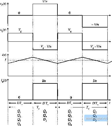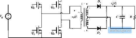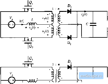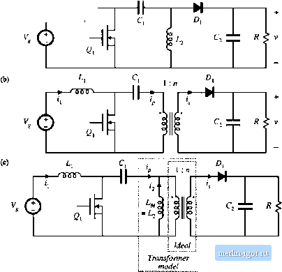 Строительный блокнот Introduction to electronics iit) ТЛЛГ - ouu -r ![]() Fig. rt,34 PuH-bntlgti trunsormeir-istjIijLed boost ctinvertci. Conducting devices: ![]() Fig* <>ь35 WiLveform.4 oflhe traiisfonnei-lsobted full-bridgt; Ьооа\ t;tiiiveiitf] , CCM. increases with slope VJL, and eiieigy is transferred from the de source V to inductor L. During the second subinterval, transistors and Q- operate in the off state, so that inductor L is connected via transistors fii and 64 through the transformer and diode to the dc output. The next switching period is similar, except that during subinterval 2, transistors 2; and operate in the off .state, and inductor L is connected via transistors and through the transformer and diode to the dc output. If the transistor off-times and the diode forward drops are identical, then the average transformer voltage is zero, and the net volt-seconds applied to the transformer magnetizing inductance over two switching peritjds is zero. Application ofthe principle of inductor volt-second balance to the inductor voltage waveform vit) yields (6.48) Solution for the conversion ratio M(D) then leads to (6,4)) This result is similar to the btKJSt converter M[D\ with an added factor of u due to the transformer turns ratio. The transistors must block the reflected load voltage V/ii - VJD. In practice, additional voltage ( ) ![]() R < V Щ 1 CZtZ R < V Tl Г Fig. 636 Pusli-pull isolated converters; (a) based on the bousr converter, (b) based on the Watkins-Johnson convener. is observed due to ringing associated with the transformer leakage inductance. Because the instatitaneous transistor curretit is limited by inductor L, saturation of the transformer due to small imbalances in the semiconductor forward voltage drops or conduction times is not catastrophic. Indeed, control schemes are known in which the transformer is purposely operated in saturation during subinterval 1 [13, 15]. A push-pull configuration is depicted in Fig. 6.36(a). This configuration requires only two transistors, each of which must block voltage 2V!n. Operatitm is otherwise similar to that of the full-bridge. During subinterval 1, both transistors conduct. Daring subinterval 2, one of the transistors operates in the off state, and energy is transferred from the inductor through the transforiner and one of the diodes to the output. Transistors conduct during subinterval 2 during alternate switching periods, such that transformer volt-second balance is maintained. A similar push-pull version of the Watkins-Johnson converter, converter 6 of Fig. 6.14, is illustrated in Fig. 6.36(b). 6J.6 Isohited Versions of the SEPIC and the Cuk Converter The artifice used to obtain isolation in the flyback converter can also be applied to the SEPIC and inverse-SEPlC. Referring to Fig. 6.37(a), inductor can be realized using two windings, leading to the isolated SEPIC of Fig. fi.37(b). An equivalent circuit is given in Fig. 6.37(c). It can be seen that the mag- ![]() Fig. 6.37 Obtaining isokition in the SEPIC: (a) basic nonisolated conveiter, (b) isolated SEPIC, (e) with transformer equivalent circuit modef |
