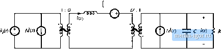 Строительный блокнот Introduction to electronics DKi) !dU)C) С Ф v(() к R Fig. 7.14 Circuit equivaleni to the sntall-signiil ac ciipiicitiiriiode eciualinn of Bq, (7,43) or (7,39). 0 >© ![]() Fig. 7,1S Circuil etiiiivaieilt to lire small-signal i\c input sotirce ctirreitt etpiatiou of Eq, (7,43) or (7,42), ognized as the current flowing through the load resi.stor in the .small-.signal model. The resistor is connected in parallel with the capacitor, such that the ac voltage across the resistor R is v(f) as expected. The term Щ{) is driven by the control iiiputf/(0, and is represented by an independent source as shown. Finally, the input current equation of (7.43), or Eq. (7,42), describes the small-signal ac current l(f) drawn by the converter out of the input voltage source P.O)- This is a node equation which states that i(t) is equal to the currents in two branches, as illustrated in Fig. 7.15, The first branch, corresponding to the ОГ{01егп1, is dependent tm the ac inductor current t(i). Hence, we represent this term using a dependent current source; this .source will eventually be incorporated into an ideal transformer. The second branch, corresponding to the ii?(i) term, is driven by the control input J(/), aud is represented by an independent source as shown. The circuits of Figs. 7.13, 7.14, and 7.15 are collected in Fig. 7.1fi(a). As discussed in Chapter 3, the dependent sources can be combined into effective ideal transformers, as illustrated in Fig. 7.16(b). The sinusoid superimposed on the transformer symbol indicates that the transfurmer is ideal, and is part of the averaged small-signal ac model. So the effective dc transformer property of CCM dc-dc converters also influences small-signal ac variations in the conveiter signals. The equivalent circuit of Fig. 7.1(i(b) can now be solved using techniques of conventional linear circuit analysis, to find the converter transfer functions, input and output impedances, etc. This is done in detail in the next chapter. Also, the model can be refined by inclusion of losses aud other nonidealities- an example is given in Section 7.2.9. 7.2.7 Discussion of the Perturbation and Linearization filep In the perturbation and linearization step, it is assumed that an averaged voltage or current consists of a constant (dc) component and a small-signal ac variation around the dc component. In Section 7.2.5, the oo,<o ![]() Fig, 7,16 Buclc-bousl cnnverter smiill-bignal ac equivalent circjit: (a) the circnits of bigs. 7.13 to 7.15, collected logeEher; (b) combination iif dcpendoit sources into effective tdeid tiansfortner, leading li> the final ]iiodel. linearization step wa.s completed by neglecting nonlinear Eerins that correspond to products of the small-signal ac variations. In general, the linearization step amounts to talting the Taylor expansion of a nonlinear relation and retaining only the constant and linear terms. For example, the large-signal averaged equation for the inductor current in Eq. (7.28) can be written as: (7.44) Let ufi expand this expression in a three-dimensional Taylor series, about the quiescent operating point (V, V.Dy. [dt dt j V = V d(t) v= v + liigher-order iionlinear terms (7.45) For simplicity of notation, the angle brackets denoting average values are dropped in the above equation. The derivative of / is zero, since i is by defiiution a dc (constant) term. Equating the dc terms on both sides of Eq, (7.45) gives: (7,46) which is the volt-second balance relationship for the inductor. The coefficients with the linear terms on the right-hand side of Eq. (7.45) are found as follows: (7,47) v = V d = D = V,.-K (7.49) Using (7.47), (7,48) and (7,49), neglecting higher-order nonlinear terras, and equating the linear ac terms on both sides of Eq. (7.45) gives: L = Dv(f) + Df(0 + [ V, - V) M (7.50) which is identical to Eq. (7.36) derived in Section 7.2.5. In conclusion, the linearization step can always be accomplished using the Taylor expansion. 7.2.S Results for Several Basic Converters The equivalent circuit models for the buck, boost, and buck-boost converters operating in the continuous conduction raode arc suramarized in Fig. 7.17. The buck and boost converter models contain ideal transformers having turns ratios equal to the converter conversion ratio. The buck-boost converter contains ideal transformers having buck and boost conversion ratios; this is consistent with the derivation of Section 6.1.2 of the buck-boost converter as a cascade connection of buck and bcKist converters. These models can be solved to find the converter transfer functions, input and output impedances, inductor current variations, etc. By insertion of appropriate turns ratios, the equivalent circuits of Fig. 7.17 can be adapted to model the transforraer-isolated versions of the buck, boost, and buck-boost converters, including the forward, tlyback, and other converters. 7.2.9 Example: A Nonideal Flyback Converter To illustrate that the techniques of the previous section are useful for modeling a variety of converter phenoraena, let us next derive a small-signal ac equivalent circuit of a converter containing transformer isolation and resistive losses. An isolated flyback converter is illustrated in Fig, 7.IS, The flyback transformer has magnetizing inductance L, referred to the primnry winding, and turns ratio 1 \iu MOSFET has on-resistance R, . Other loss elements, as well as the transformer leakage inductances and the switching losses, are negligible. The ac modeling of this converter begins in a manner similar to the dc converter analysis of Section 6.3,4. The flyback transformer is replaced by an equivalent circuit consisting of the magnetizing inductance L in parallel with an ideal transformer, as illustrated in Fig. 7.19(a). During the fust subinterval, when MOSFET conducts, diode is off. Tlie circuit then |