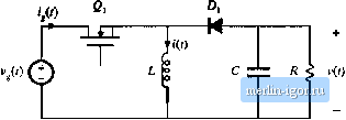 Строительный блокнот Introduction to electronics result is {y{t))j =(/(0fc,{x(l))r +E,(u(0)] + rfi;t)(Cj(x(t)) 1-E,{ (0) \ (7.107) Rearrangement of terra.s yields This is again a nonlinear equation. The averaged state equations, (7,106) and (7.108), are oolleeted below: d{i) A. + dV) A,] (51(0)+ [dit) В, + d(t) Bj] {11(f)) {m)r{m c, + d\t) Ci) {x(o)j./((J(OE,+d(t) Ej) (uo)).,. (7.108) (7Л09) The next step is the linearization of these equations about a quiescent operating point, to construct a small-signal ac model. When dc inputs d(t) = D and u(() = U are applied, converter operates in equilibrium when the derivatives of all of the elements of {х(/)} are zero. Hence, by setting the derivative of (x(f))jj to zero in Eq. (7.109), we can define the converter quiescent operating point as the solution of 0=AX+BU Y = CX + RU (7.110) where definitions (7.93) and (7.94) have been used. We now perturb and linearize the converter waveforms about this quiescent operating point: (s(0)r=X.Hi(O (ii(0)=U + O(0 d{t) = D + d(r) d\t) = a-S(,t) (7.111) Here, U(() and d{t) are small ac variations in the input vector and duty ratio. The vectors x(0 and y(f) are the resulting small ac variations in the state and output vectors. We must assume that these ac variations are much smaller than the quiescent values. In other words. Xls.K(0 111-*№) Here, к X ii denotes a norm of the vector x. Substitution DfEq. (7.11 1) into Eq. (7.109) yields (7.112) ri(X+ S(f)) Л+ d(l}]A , 4 (D-(/(f)] Л J (X+ (f)) D-K/(o)Bi + (D-d(/))lij (u+0(f)) + [D+dU)]E, + {Ly--thn]E, [U+u(0) The derivative dX/rfr is zero. By eoUecting terras, one obtains КхЩ = (aX + BU]+\S<t) + Ba(f) + [A,-Aj)X + (Bi-B3)uy(/) first-order EC dc terms first-order ac (ernrs + (a 1 - A i)x(r)i(0 + (Bi - Bi)a(f) second-order nonlinear terras (7,113) (7,114) {Y*m] = (CX + EUj + cm + Kfl(0 + {[C,- C,)X - (e, -E,)uy(f) dc + 1 order ac de terms first-order ae terms + (C, - Сз)х(/)J(f) + (E, - Ej]u(/V(t) v, second-order nonlinear terms Sinte the dt terms satisfy Eq. (7.110), they drop ont of Eq. (7.114). Also, if the stnali-signal assumption (7.112) is satisfied, then the second-order nonlinear terms of Eq. (7.114) are small in magnitude compared to the first-order ac terms. We can therefore neglect the nonlinear terms, to obtain the following linearized ac model: . ffS(0 dt y(() = Cx(/)-(-Efl(/) + К = Ax(() -r m/} + (A, - A i] X + (в, - в J uU(f) (C,-C,)X + (E,-E,] Vthi) (7.115) This is the desired result, which coincides with Eq. (7.95). 7.3.4 Example: State-Space Averaging uf a Nonideal Buck-Boost Converter Let lis apply the state-space averaging methtxl to model the buck-btx)st converter of Fig. 7.31. We will model the conduction loss of MOSFET byon-resistance Л , and the forward voltage drop of diode ![]() Fig, 7,31 Cuck-boost converter example. i>] by an independent voltage source ofvalue V. It is desired to obtain a complete equivalent circuit, which models both the input port and the output port of the converter, The independent states of the converter ate the inductor current ;{/) and the capacitor voltage \>(f). Therefore, we should define the state vector x(r) as \{!}-- v(!) (7.116) The input voltage vU) is an independent source which should be placed in the input vector u(r). hi addition, we have chosen to model the diode forward voltage drop with an independent voltage source of value Vq. So this voltage source should also be included m the input vector ii(r). Therefore, let us define the input vector as u(f) = (7.117) To model the converter input port, we need to rind the converter input current ((;). To calculate this dependent current, it should be included in the output vector y(r). Therefore, let us choose to define y{l) as y(r) = i,il) (7.118) Note that it isnt necessary to include the output voltage v{t] in the output vector y((), since v{t) is already included in the state vector x(r). Next, let us write the state equations for each subinterval. When the switch is in position 1, the converter circuit of Fig. 7.32(a) is obtained. The inductor voltage, capacitor current, aud converter input current ate /. = v (0-i(O/t, clvit) v(() (7,119) dt ~ R i,it) = Hl) These equations can be written in the following state-space form: |