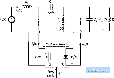 Строительный блокнот Introduction to electronics 226 AC Ei/uivalent Circuit Modtliiig !d{i)(T) С Ф HO к R ![]() Fig. 7.34 Circuits equivalent tf) the small-signiil converter equations: (n) inductor loop, (b) capacitor node, (c) input pni-t. V +V -7ff ![]() Fig. 735 Complete small-signal uc equivalent circuit model, ttonideal buck-boost converter exatnple. lA CIRCUIT AVERA(iIN(i AND AVERAGED SWITCH MODELIN(i Circuit averaging is another well-known technique for derivation of converter equivalent circuits. Rather than averaging the converter state equations, with the circuit averaging technique we average the converter waveforms directly. All tnanipulation.s are performed on the circuit diagram, instead of on its ec]ua- , dKt) titms, and lieiite the tirtiiit averaging technique gives a more piiysieal interpretatimi to tiie mtwiel. Since circuit averaging involves averaging and small-signal linearization, it is equivalent to state-space averaging. However, in tnany cases circuit averaging is easier to apply, and allows the small-.iiglial ac tnodcl to be written almost by inspection. The circuit averaging technique can also be applied directly to a number of different types of converters and sv/itch elements, including phiLse-controUed rectifiers, PWIVl converters operated in discontinuous conduction mode or with current programming, and quasi-resonant converters-these are described in later chapters. However, in other ca.4es it may lead to involuted models that are less easy to analyze and understand. To overcome this problem, the circuit averaging and state-space averaging approaches can be combined. Circuit averaging was developed before state-space averaging, and is described in [4]. Because of its generality, there has been a recent resurgence of interest in circuit averaging of switch networks [13-20]. The key step in circuit averaging is to replace the converter switches with voltage and current sDutces, to obtain a time-invariant circuit topology. The waveforms of the voltage and current generators are defined to be identical to the switch wavefonns ofthe original converter. Once a time-invariant circuit netwt)rk is obtained, then the ctmverler waveforms can be averaged over tme switching period to remove the switching harmonics. Any nonlinear elements in the averaged circuit model can then be perturbed and linearized, leading to the small-signal ac model. [n Fig. 7.3Й, the switchitig eletnents are separated from the remainder of the converter. The converter therefore consists of a switch network containing the converter switching elements, and a time-invariant network, containing the reactive and other (emaming elements. Figure 7.36 illustrates the simple case in which there are two single-pole single-throw (SPST) switches; the switches can then be represented using a two-port network, [n more complicated systems containing multiple transistors or diodes, such as in polyphase converters, the switch network may contain more than two ports. Power input © Time-invariant network containing converter reactive elements Viit) - 1,(0 (j(0 v,(0 Switch network Control input Load R < v(0 d{t) Fig. 7.36 A switchlna converter can be viewed as a switch network cniuiccted to a time-invariant network. ![]() Fig. 7Л7 SdieinLitic of the SEPIC, aminged in the fonn of big. 7.36. The eeiitiai idea of the averaged switch modeling approach is to find an averaged circuit model for the .switch network. The resulting averaged switch model can then be in.4erted into the converter circuit to obtain a complete averaged circuit model of the converter. An important advantage of the averaged switch modeling approach is that the same model can be used in many different converter configurations, [t is not necessary to rederive an averaged circuit model for each particular converter. Furthermore, in many са.чев, the averaged switch model simplifies converter analysis and yields good intuitive understanding of the converter steady-state and dynamic properties. The first step in the process of finding an averaged switch model for a switch network is to sketch the converter in the form of Fig. 7.36, in which a switch network containing only the converter switching elements is explicitly defined. The CCM SEPIC example shown in Fig. 7.37 is used to illustrate the process. There is usually more than one way to define the two ports of the switch network; a natural way to define the two-port switch network of the SEPIC is illustrated in Fig. 7.37. The switch network terminal quantities U[((), f(0. (f). andijO) are illustrated in Fig. 7.38 for CCM operation. Note that it is not necessary that the potts of the switch network be electrically connected within the switch network itself. Furthermore, there is no requirement that any of the terminal voltage or current waveforms of the switch network be nonpulsating. T.4.1 Obtaining a Time-Invariant Circuit The first step in the circuit averaging technique is to replace the switch network with voltage and current sources, such that the circuit connections do not vary in time. The switch network defined in the SEPIC is shown in Fig. 7.39(a). As with any two-port network, two of the four terminal voltages and |