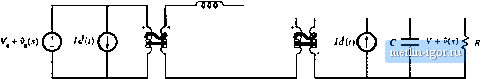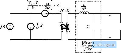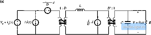 Строительный блокнот Introduction to electronics Fig. 7.58((]). This model predicts that the small-signal control-to-out:put transfer function is (7Л67) This transfer function is found hy setting the 0(s) variations to zero, and solving for the dependence of C(i) on c?(j). Figure 7.5S(d) is the complete canonical circuit, which can model any PWM CCM dc-dc converter. 7J.2 Example: ManipulatJon of the Buck-Boost Converter Model into Cimonical Form To illustrate the steps in the derivation of the canonical circuit model, let us manipulate the equivalent circuit of the btick-boost converter into canonical form. A small-signal ac equivalent circuit for the buck-boost converter is derived in Section 7.2. The result, Fig. 7.16(b), is reproduced in Fig. 7.59. To manipulate this network into canonical form, it is necessary to push all of the independent d{T) generators to the left, while pushing the inductor to the right and combining the transformers, The (,V - V)d(l) voltage source is in series with the inductor, and hence the positions of these two elements can be interchanged. In Fig. 7.60(a), the voltage source is placed on the primary side of the l.-Dideal transformer; this requires dividing by the effective turns ratioD. The otitput-side/<f(0 current source has also been moved to the primary side of the /):[ transformer. This requires mtiltiplyingby the turns ratio l/D, The polarity is also reversed, in accordance with the polarities of the D.\ transformer windings. Next, we need to move the ld{tyD current source to the left of the inductor. This can be done using the artifice illustrated in Fig. 7.60(b). The ground connection of the current source is broken, and the source is connected to node Л instead. A second, identical, current sotirce is connected from node A to ground. The second source causes the current flowing into node A to be unchanged, such that the node equations of Figs. 7.60(a) and 7.60(b) are identical. In Fig. 7.60(c), the parallel combination of the inductor and current source is converted into Thevenin equivalent form. The series combination of an inductor and voltage source are obtained. In Fig. 7.60(d), the ldit)/U current source is pushed to the primary .side of the V.D transfortner. The magnitude of the current sotirce is multiplied by the turns ratio D. In addition, the current source is pushed through the (V, - V)dityD voltage source, using the previously described artifice. The ground connection of the source is moved to node S, and an identical source is connected from node В to ground such that the circuit node equations are unchanged. 1 : D GD: 1 ![]() Fig. 7.59 Small-signal ac model of tbe buck-boost converter, before nianipubiiott into canonical form. V.-V ![]() T f 1 T ж f 1 V.-V St/ J с ±Z VtU)k R 1:D л D:l тллр Fig. 7.60 Steps in the tiianipulation of the buck-boost ac inodel into canonical form. ![]() ZZ. V + v(i) < R Fig. 7.61 Ttie buck-boost conveiter nunlel, in canonical lorm. Figure 7.6] is the final form of the model. The iniiuctor is moveti to the seconiiary side of the D: 1 transfonner, by multiplying by the square of the turns ratio as shown. The sLl3(tyD voltage source is moved to the primary side of the 1 :Z) transformer, by dividing by the turns ratio D. The voltage and current sources are combined as shown, and the two transformers are combined intt) a single D.D transformer. The circuit is now in canonical form. It can be seen that the inductance of the effective lt)w-pass filter is not simply equal to the physical inductor value L, but rather is equal to LID. At different quiescent operating points, with different values of D, the value of the effective indtictance will change. In ct)nseqtience, the transfer function, input impedance, and output impedance of the effective k)W-pass filter will also vary with quiescent operating point. The reason for this variation is the transformation of the inductance value by the effective D:i transformer, It can also be seen from Fig. 7,fil that the coefficient of the (/() vohage generator is ft,lj (7.168) This expression can be simplified by substitution of the dc relationships (7.29). The result is (7.169) When we pushed the output-side /<f(l) ctirrent source thrt)ugh the inductor, we obtained a voltage source having a frequency dependence. In consequence, the e(,v)rf voltage generator is frequency-dependent. 7.S.3 Canonical Circuit Parameter Values for Some Common Converters For ideal CCM PWM dc-dc converters containing a single inducttff and capacittjr, the effective low-pass filter of the canonical model should contain a single inductor and a single capacitor The canonical model then redtices to the circuit of Fig. 7.62. It is assumed that the capacitor is connected directly across the load. The parameter values for the basic buck, boost, and buck-boost converters are ctjllected in Table 7.1. Again, it should be pointed out that the effective inductance depends not only on the physical |