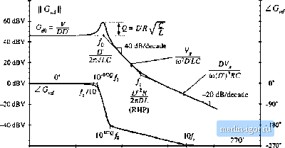 Строительный блокнот Introduction to electronics Converter Transfer Functions The engineering design process is comprised of several major steps: 1. Specifications and other design goals are clefined. 2. A circuit is proposed. This is a creative process (hat draws on the physical insight and experience of the engineer. 3. The circuit is modeled. The converter power stage is modeled as described in Chapter 7. Components and other portions of the system are modeled as appropriate, often with vendor-supplied data. 4. Desigii-orienred ajiaiy.vis of the circuit is performed. This involves development of equations that allow element values lo be chtjsen such that specifications and design goals are met. In addition, il may be necessary for the engineer to gain additional understanding and physical insight into the circuit behavior, so that the design can be improved by adding elements lo the circuit or by changing circuit connections. 5. Model verificariou. Predictions of the т(к1е1 are companjd to a laboratory prototype, under nominal operating conditions. The model is refined as necessary, so that the model predictions agree with laboratory measurements. 6. Worst-case analysis ior other reliability and production yield analysts) ofthe circuit is performed. This involves quantitative evaluation ofthe model performance, to judge whether specifications are met under all conditions. Compulersimulation is well-suited to this task. 7. Iteration. The above steps are repeated to improve the design until the worst-case behavior meets specifications, or until the reliability and production yield are acceptably high. This chapter covers techniques of design-oriented analysis, measurement of experimental transfer functions, and computer simulation, as needed in .steps 4, 5, and 6. Sections S.l to S.3 discuss techniques for analysis and construction of the Bode plots of the converter tran.sfer functions, input impedance, and output impedance predicted by the equivalent circuit Uiie input ![]() ОмрШ