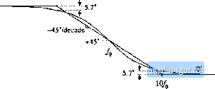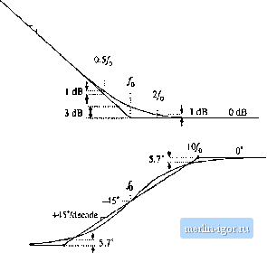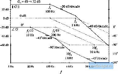 Строительный блокнот Introduction to electronics Fig. 8.14 Inversion of the frequency axis: summary of the magnitude and phase Bode plots for the inverted real polo, I GO-co) II, ![]() +20 dB/decade +90° / Л0 ![]() 8.1,4 Frequency Inversion Two other forms arise, from inversittn of the frequency axis. The inverted pole has the transfer function (a.i-i) As illustrated in Fig, S,14, the inverted pole has a high-frequency gain of 1, and a low frequency asymp-tt)te having a Ч-20 dB/decade slope. This form is useful for describing the guin of high-pass tillers, and of other transfer functions where it is desired to emphasize the high frequency gain, with attenuation of low-frequencies. Equatitm (8,35) is equivalent to C(.!) = (8.36) However, Eq. (8.35) more directly emphasizes tliat the high frequency gain is 1. The inverted zero has the form (8,37) As illustrated in Fig. 8,15, the inverted zero has a high-frequency gain asymptote equal to 1, and a low-frequency asymptote having a slope equal to -20 dB/decade. An example of the use of this type of trans- Converter Тпшфг Fuucfionx II с(/ш) lu -,-20 dB/deeade Fig, S,1S Inversion ol llie frequency axis: summary of (he ningnimdc and phase Bode pior for Lhe inverted real zt№. ZGiJw) -W ![]() / /10 fer function is the proportional-pius-integral controller, discussed in connection with feedback loop desigu in the next chapter Equation (8.37) is equivalent to (ij.38) However, Eq. (8.37) is the preferred form when it is desired to emphasize the value of the high-frequency gain asymptote. The use of frequency inversion is illustrated by example in the next section. 8.1.5 Combinations The Bode diagram of a transfer function contuining several pole, zero, and gain terms, can he constructed by simple additittn. At any given frequency, the magnitude (in decibels) of the cttmposite transfer function is equal to the sum of the decibel magnitudes of the individual terras. Likewise, at a given frequency the phase of the composite transfer function is equal to the sum of the phases of the individual terms. For example, suppose thut we have already constructed the Bttde diugrums t)f twt) complex-valued functions of 0), G((j)) und G2((U), These functions have magnitudes Л(0)) and Rif), and phases ej(iu) and Й2(а)), respectively. It is desired to construct the Bode diagram of the prttdiict Cj(tu) = O((0)G2(Ci)). Let Оэ(Ш) have magnitude Л(Ш), and phase 6((li).To find this magnitude and phase, we can express ((ш), (O)), and f rj((J)) in polar form: Cl{iii)R,Ыe The product Gj(ti)) can then be expressed as С,(ш) = С((0)(;з(ш) = /(.аде ! Й2(й))й-*2 Simplification leads tt) Hence, the composite phine is Tiie total magnitude is When exipressed in decibels, Eq. (8.43) becomes (8.39) (8.40) (8.41) (3.42) (8.43) (8.44) So the composite phase is the sum tifthe individual phases, ami when expressed in decibels, the composite magnitude is the simi of the individual magnitudes. The composite magnitude slope, in dB per decade, is therefore also the sum ofthe individual .slopes in dB per decade. II Gil 40dB ![]() 100 kHi Fig. 8,16 Conatruclion of magnitude and phase asymptotes for the ttansler function of Eq,(B.45). Dashed line |