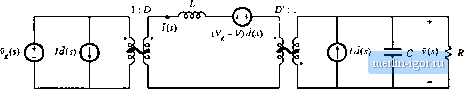 Строительный блокнот Introduction to electronics (8.97) It is desired to factor tlte deuoininator, to obtain analytical expressions for the poles. The correct way to do this depends on the numerical values qIR,L, L, and C. When the roots are real and well separated, then Eq. (8.89) predicts that the denominator can be factored as follows: 1 +s \+sRC According to Eq. (8.88), this approximation isjustified provided that (8,98) (8,99 Ttiese inequalities cannot be satisfied unless L. When L, l, then Eq. (8.99) can be further simplified to (ii.iOO) The approximate factorization, Eq. (8.98), can then be further simplified to Thus, in this case the transfer function contains three well separated real poles. Equations (8.98) and (8.101) represent approximate analytical factorizations of the denominator of Eq. (8.96). Although numerical values tnust be substituted into Eqs. (8.99) or (8.100) to justify the approximation, we can nonetheless express Eqs. (8.98) and (8.101) as analytical functions of L L, R. and C. Equations (8.98) and (8.101) are design-oriented, because they yield insight into how the element values can be chosen such that given specified pole frequencies are obtained. When the second inequality ofEq. (8.99) is violated. Л, + Z,2 R then the second and third roots should be left in quadratic form: (8.i02) (8,10.4) This expression follows from Eq. (8.91), with к = 2. Equation (8.92) predicts that this approximation is justified provided that S.2 Analysis of Convener Transfer Functions (8.104) In application t)f Eq. (8.92), we talte а to be equal to 1. The inequalities of Eq. (8.104) can be siinplifietl to obtain Л,.1;. and RC (8.105) Note that it is no longer required that RC Lj/ff, Equation (8.105) implies that factorization (8.103) can he further simplified to 1 +i- 1 + jfiC + .v=L,C (3.106) Thus, lor this case, the transfer function contains a low-frequency pole that is well separated from a high-frequency quadratic pole pair. Again, the factored result (8.106) is expressed as an analytical function of the element values, and consequently is design-oriented. Iti the ca.se where the first inequality of Eq. (8.99) is violated: then the first and second roots should be left in quadratic form: (S.107) (8.108) This expression follows directly from Eq. (8.94). Equation (8.95) predicts that this approximation isjustified provided that that is. f.,fiC f.,+J f., J.J R R f.,3-L and RC (8.109) (a.ilo) For this case, the transfer function contains a low-frequency quadratic pole pair that is well separated from a high-frequency real pole. If none of the above approximations are justified, then all three of the roots are similar in magnitude. We must then find other means of dealing with the original cubic polyno-tnial. Etesign of input filter.s, including the filter of Fig. 8.28. is ctwered in Chapter 10. ANALYSIS OF CONVERTER TRANSFER FUNCTIONS Let u.4 next derive analytical expressitms for the poles, zeroes, and asympt[)te gains in the transfer functions of the basic ctmverters. ![]() Fig. Я.29 Hut к-boost cotiverter equivalent circuit derived in .Section 7.2. 8.2.1 Example: Transfer Functions of the Buck-Boost Converter The small-sigual equivalent circuit model of the buck-boost converter is derived in Section 7.2, with tlie result [Fig. 7.16(b)] repeated in Fig. 8.29. Let us derive and plot the control-to-output and line-to-output transfer functions for tliis circuit. The converter contains two independent ac inputs: the contr[)l input and the line input f,(l The ac output voltage variations iis) can be expressed as the superposition of terms arising from these two inputs: C(:) = GJs)J{s) + C;, (j) v.v) Hence, the transfer functions 0,s} and OJ,s) can be defined as ад . , v(s) and G,Js)= (h.lll) (8. II2) rt.)-ii To find the line-to-output transfer function G,J\), we .set the il sources to zero as in Fig. 8.30(a). We can then push the vja) .source and the inductor through the transformers, to obtain the circuit of Fig. 8.30(b). The transfer function C;,,(i} is found using the voltage divider formula: 1 -.D D: ] С V{5) < R Fig, Я.,3в Manipulation of btick-boost cquivaieitt c\rcm to find f!ie linc-fo-OHtpUl tratwfei fuiicdoit Gis): (it) set d sources to y.em; (b) pn.4li tntliictor and source dirotigh tiansfomicr. |